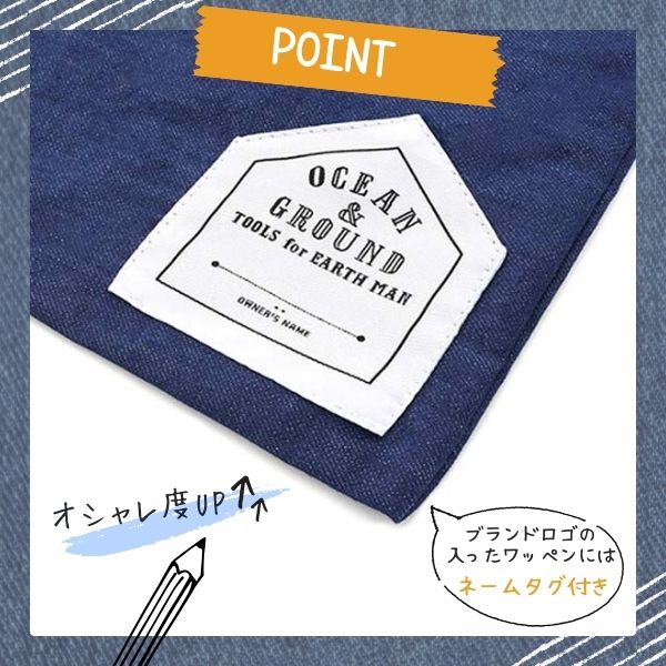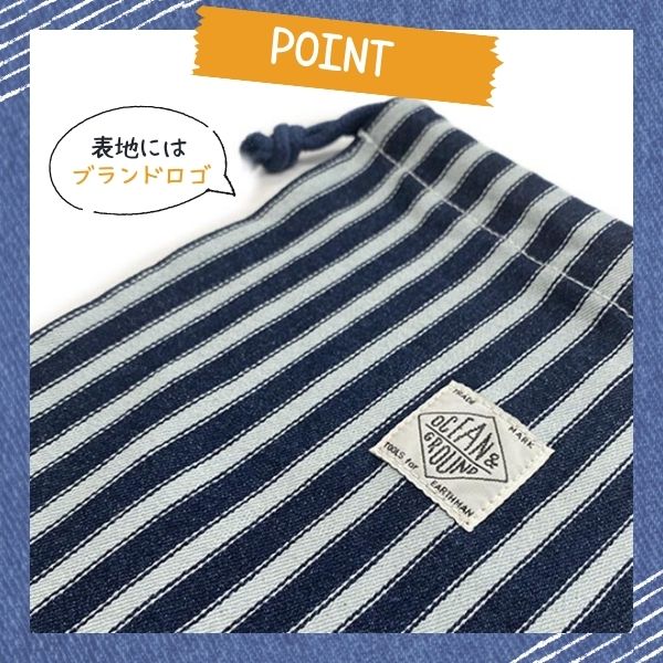 シンプル、かつオシャレなデニム&ヒッコリーの巾着が素材を変えてリニューアル!表は小さいブランドタグ、裏はお名前を書けるタグになっているところも◎キッズはもちろん大人のトラベルポーチや、小物入れとしてもGOOD。