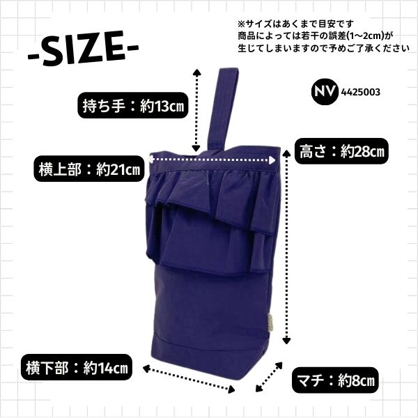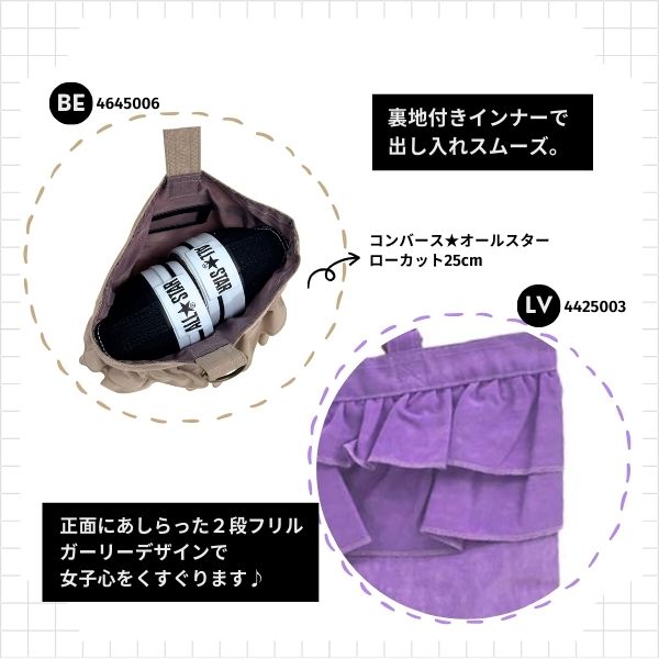 フリルたっぷり♪だけど、シンプルで、かわい過ぎない絶妙さが好評のシューズケース!【4645006】では柔らかいカラー展開にアップデート!軽くて丈夫なナイロン100%。お子さまも開閉しやすい輪っか式。プライバシーを配慮したインナーについたネームホルダー。リュックやレッスンバッグとお揃いで持ってもかわいいですよ◎!