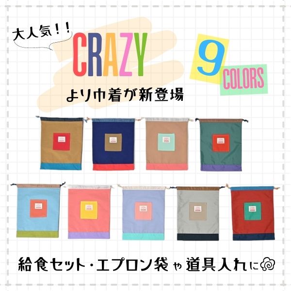 おしゃれな配色が大人気のCRAZYシーリズより巾着が新登場★こちらはお箸やランチョンマットなど給食セットを入りたり、小物を入れたり、マルチに使いやすい中サイズ。丈夫なナイロン素材で、汚れも気にせず使えます。お名前を書けるロゴタグと、小さなポケット付き。表裏でカラーが違って印象が変わるのもうれしいポイント!キッズはもちろん大人のトラベルポーチや、小物入れとしても◎!