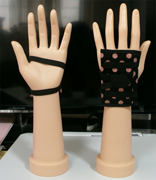 リング、帯、またはゴム紐で袋部を手や掌に装着します。
