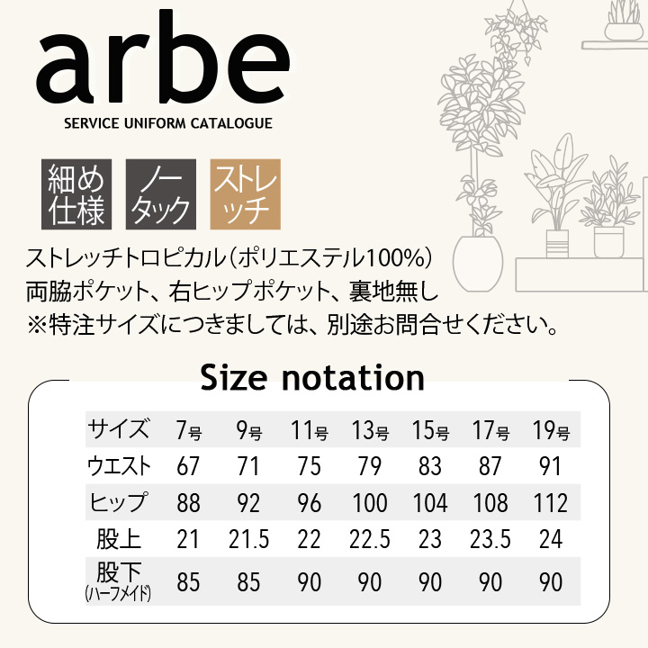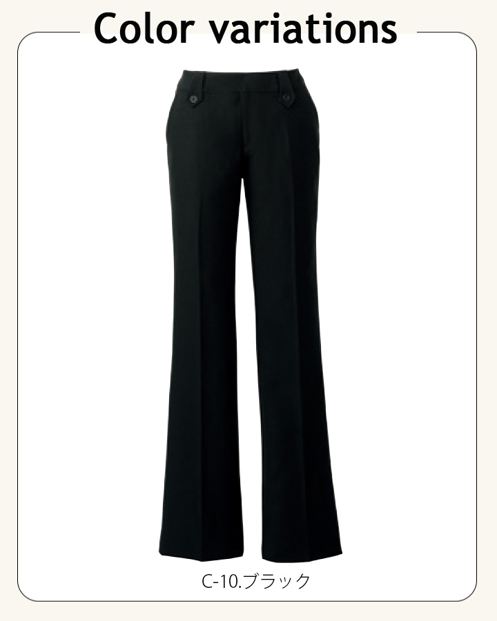 | 説明 特徴 | 飲食をはじめ、さまざまなシーンで活躍。 ノータックの細め仕様でスタイリッシュな印象のレディーススラックス。ボタン使いのベルト通しがアクセント。 ホテルやセレモニーなどの改まった場所からアミューズメントなどの華やかな場所まで幅広く活躍します。 |