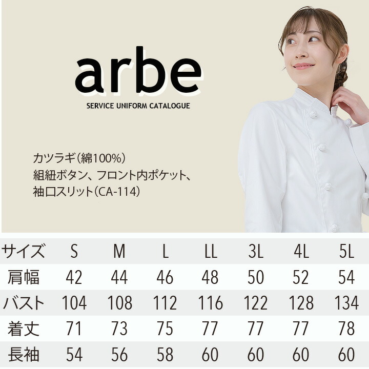 コックコート 長袖 アルべ arbe CA-114 男女兼用 カフェ 飲食店 サービス業 制服 レストラン ユニフォーム
