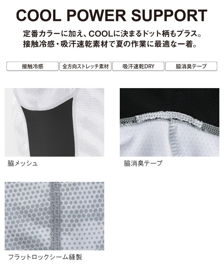 定番カラーに加え、COOLに決まるドット柄もプラス。接触冷感・吸汗速乾素材で夏の作業に最適な一着