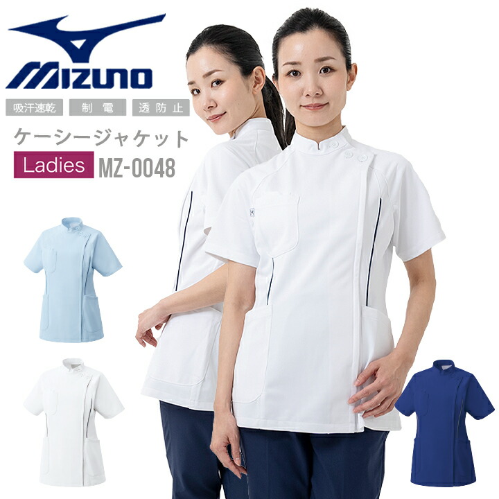 ■商品名:ケーシージャケット(女性用)■サイズ展開:S〜5L■カラー展開:ホワイト、ピンク、ネイビー■素材:トリコット■混率:ポリエステル100%■仕様:Dynamotion Fit、右胸ポケット(PHSポケット付)、両脇ポケット(右のみ中ポケット付)、右脇のみウエストループ付■機能:制菌、吸汗速乾、透防止、制電S:肩幅 37cm/バスト 94cm/着丈 67cm/そで丈 21cm/ウエスト 80cm