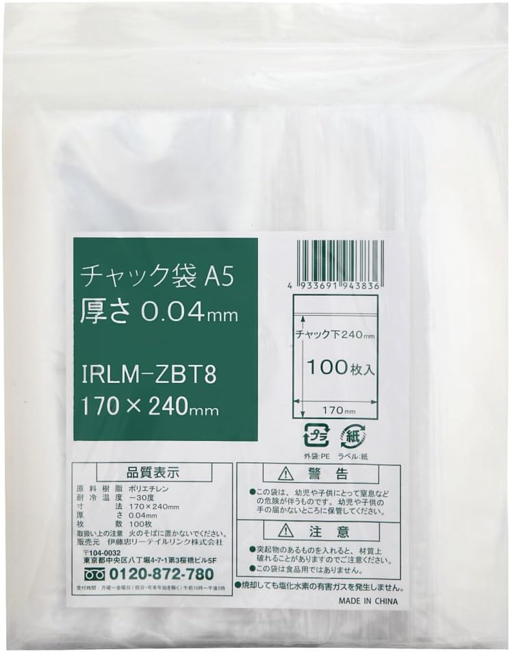 伊藤忠リーテイルリンク チャック袋 0.04mm A5 170×240mm 100枚入