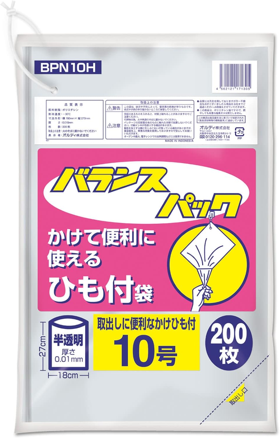 オルディ 食品保存 ポリ袋 ひも付き 規格袋 半透明 10号 縦27×横18cm 200枚入 食品衛生法適合 ビニール袋 バランスパック BPN10H ひも付ポリ袋