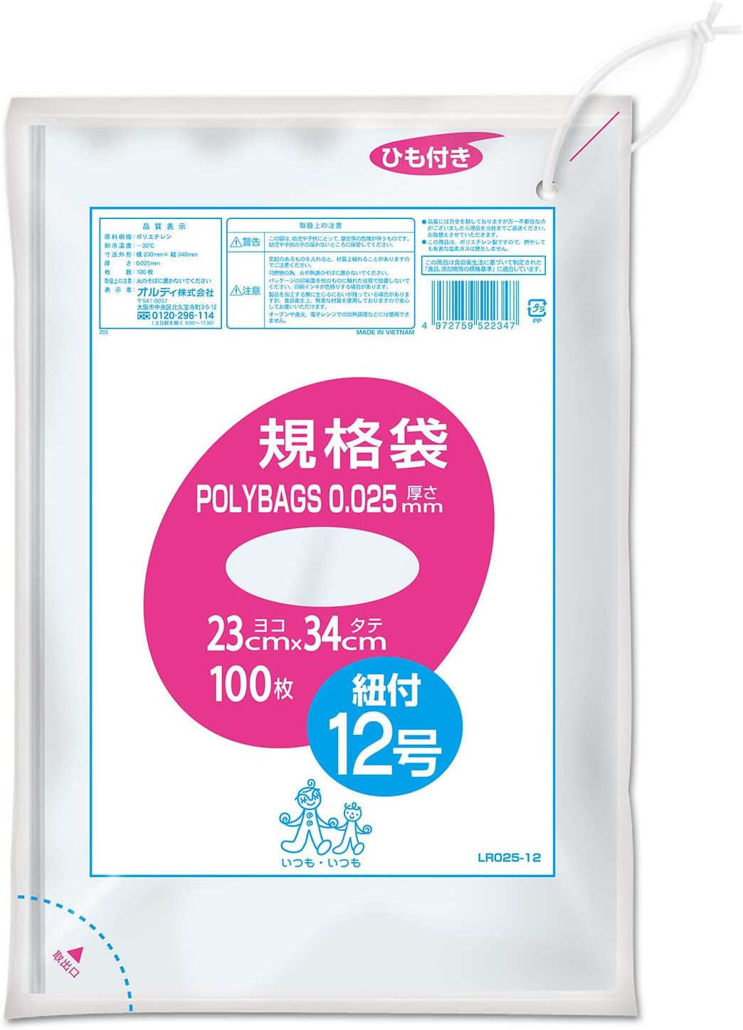 オルディ ビニール袋 キッチンポリ袋 食品保存袋 12号 ひも付き 透明 100枚入 横23×縦34cm 食品衛生法適合品 規格袋 ポリバッグ LR025-12