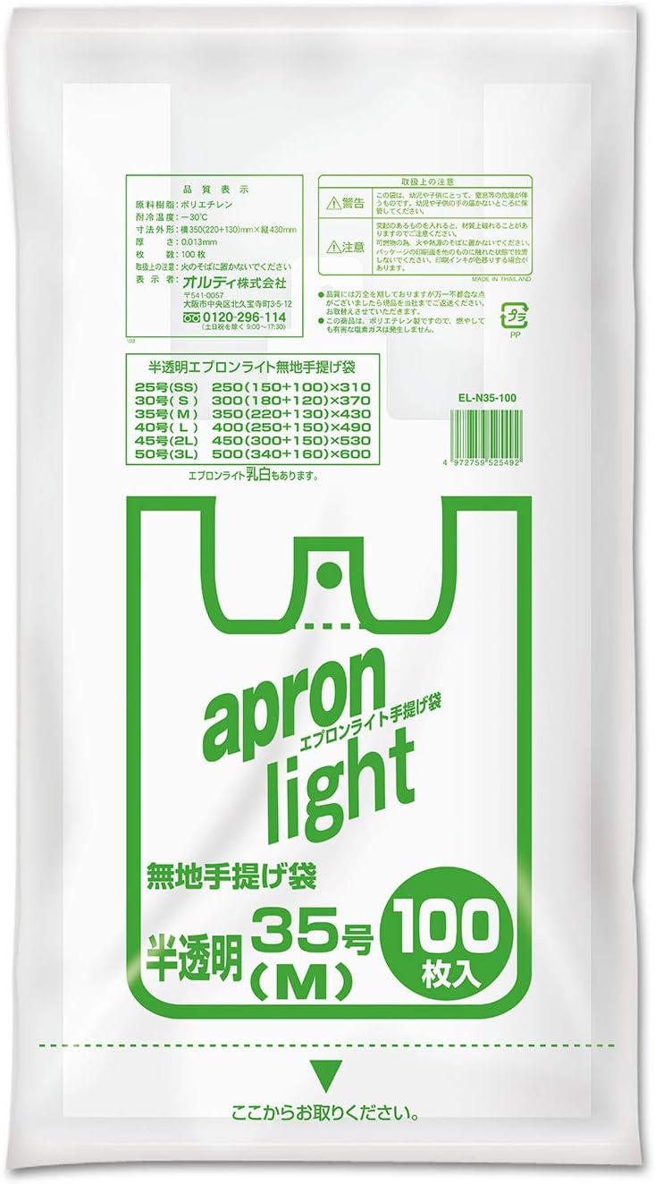 オルディ レジ袋 35号 M 半透明 100枚入 コンビニ袋 テイクアウト 取っ手付き ポリ袋 手提げ袋 エプロンライト EL-N35-100 薄手 単品