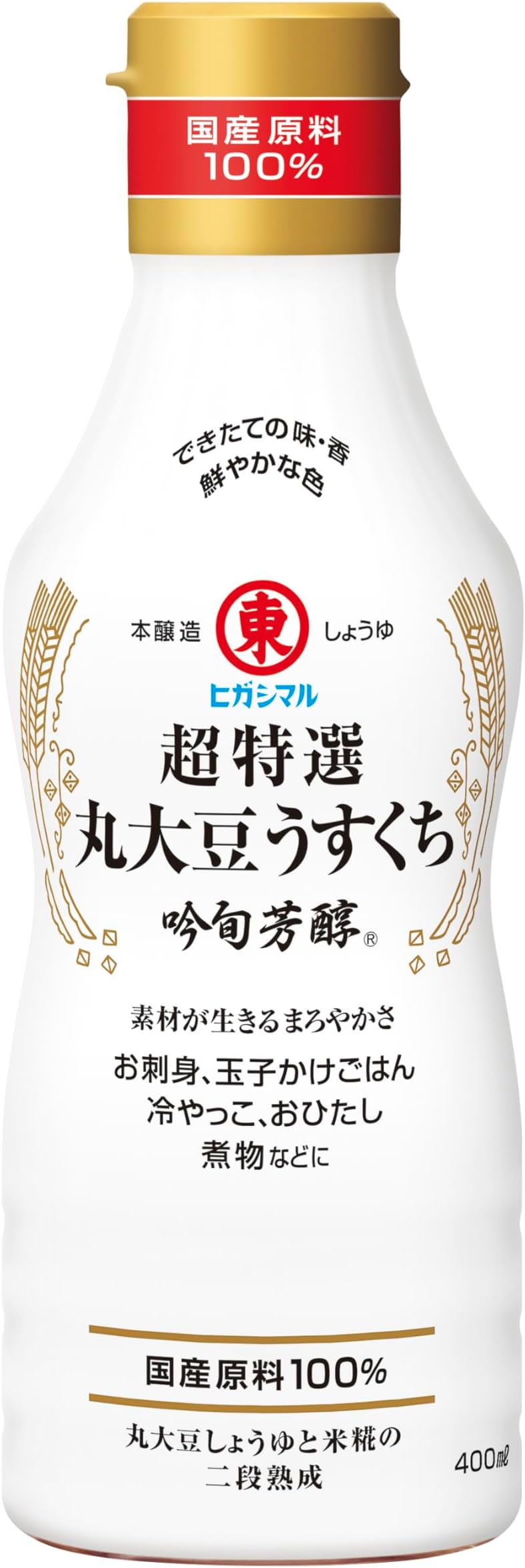 ブランド:ヒガシマル醤油パッケージ情報:ボトル商品の重量:1.55 キログラムアレルギー情報:小麦パッケージ重量:1.55 キログラム商品の形状:フレッシュボトルユニット数:3 個ブランド: ヒガシマル醤油梱包サイズ: 21.6 x 21.4 x 6.9 cm; 1.55 kg商品タイプ: フレッシュボトル容器の種類: ボトルメーカー: ヒガシマル醤油原材料: 大豆(国産)、小麦(国産)、食塩(国内製造)、米(国産)商品の重量: 1.55 Kilograms原材料:大豆 国産 、食塩 国産 、小麦 国産 、米(国産)、アルコール商品サイズ:(高さ×奥行×幅):19.5cm×19.8cm×6.6cm4902475114007ヒガシマル醤油は天正年間から四百年以上にわたり醤油を造り続けております。●華やかな香をもつ一番搾りを使用し、料理を風味豊かに仕上げます。●旨味のぎっしりつまった丸大豆の熟成諸味と二段熟成甘酒を贅沢に合わせた、まろやかで深い旨味に仕上げました。●国産丸大豆、国産小麦、国産米使用。●新採用のフレッシュボトルが搾りたての赤味ある明るい色合いを保ち、素材の色を引き立てます。●二重構造のフレッシュボトルで素材を生かすしょうゆ風味を90日保持 常温保存 ●吟味した原料を用いた醤油を旬 出来たて の状態でお届けします。