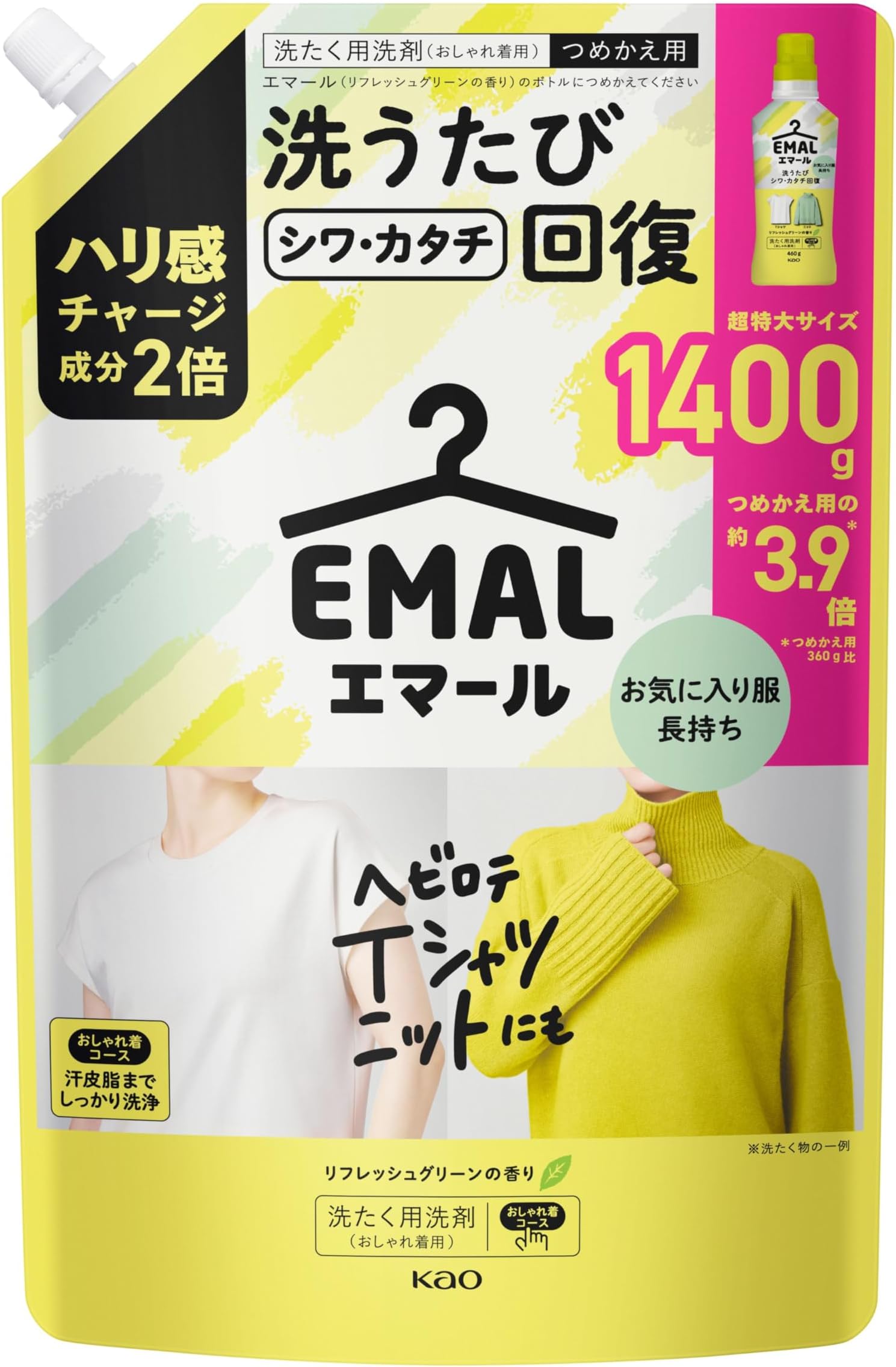 スタイル:つめかえ用 1400gブランド:エマール商品の形状:液体香り:リフレッシュグリーン素材タイプフリー:漂白剤不使用, 蛍光剤無配合商品の個数:1商品用途 使用方法:洗濯機洗い商品特長:高洗浄力メーカー:花王ハリ感チャージ成分2倍配合!ヘビロテTシャツ ニットも洗うたびシワ カタチ回復!お気に入り服がキレイに長く着られる、洗たく用洗剤(おしゃれ着用)ダメージリペア技術でセンイを内側から補修蛍光剤無配合*設備が蛍光剤配合洗剤と共用のため、微量の蛍光剤が検出されることがありますシワ、カタチ回復 伸びヨレ戻す 毛玉、縮みを防ぐ 色落ち予防、着心地 おしゃれ着コースでも汗、皮脂しっかり洗浄 ニットはもちろん、カットソー、パンツ、スカート、ワンピースなどのカジュアル服や、大切に洗いたいランジェリー、制服、ダウンジャケットにも使えます リフレッシュグリーンの香り