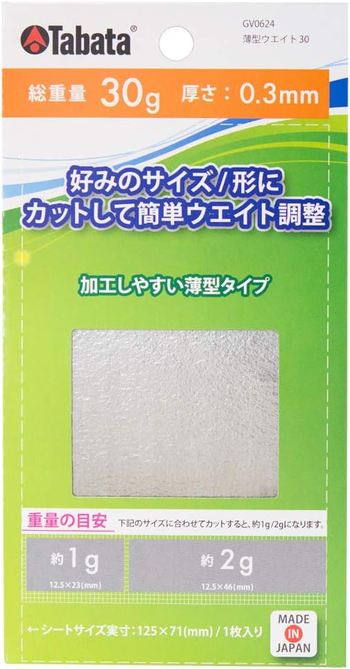 スタイル:30g(厚さ0.3mm)ブランド Tabata(タバタ)サイズ 厚さ:0.3mm色 シルバー材質 鉛個数 1製品型番 :GV0624色 :シルバーサイズ :厚さ:0.3mm素材 :鉛電池付属または内蔵 :いいえシリーズ名 :ウエイト製品サイズ :15.29 x 7.8 x 0.1 cm; 40 g貼るだけで簡単にウエイト調整ができます柔らかくなめしやすい鉛なので、剥がれにくく使いやすい1枚タイプで好きな大きさ・形にカットして使用可能30gx1枚入り厚さ:0.3mm【Tabata(タバタ)ゴルフ 薄型ウェイト】好みのサイズや形にカットできる薄型ウェイト。ヘッドバランスを調整することで最適な軌道へ調整できます!初めてでもカットしやすい重量目安シート付き。【30g(厚さ0.3mm)】:加工しやすい薄型タイプ【50g(厚さ0.5mm)】:パターのソールなど広い面を貼るのに最適