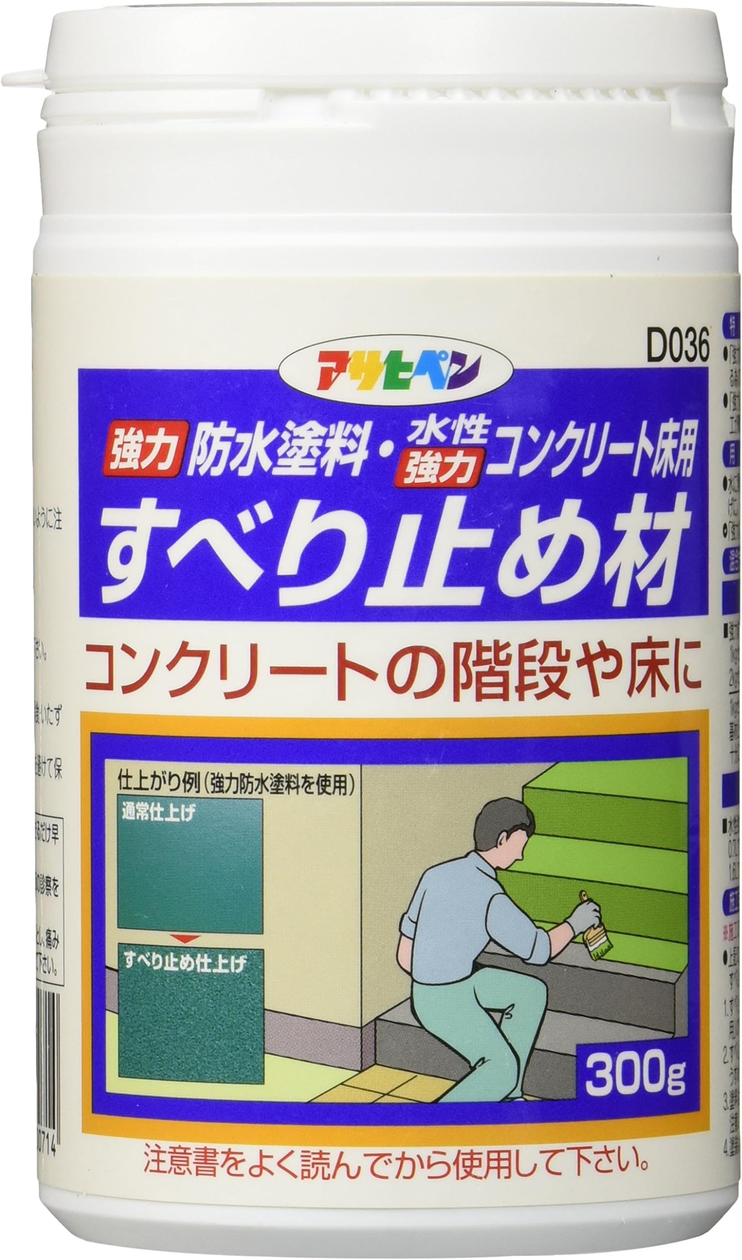 サイズ:1個ブランド アサヒペン(Asahipen)色 ホワイト仕上げタイプ 半つや消しサイズ 1個ユニット数 300 グラム商品用途・使用方法 外装商品の形状 パウダー対象年齢 大人防水性あり Trueカラーコード _ブランド :アサヒペン(Asahipen)製品型番 :D036 300g梱包サイズ :11.4 x 6.3 x 6.2 cm; 360 g色 :ホワイト電池付属 :いいえ商品の重量 :360 g内容量:300G塗料と混ぜるだけで、簡単にすべり止め施工できる