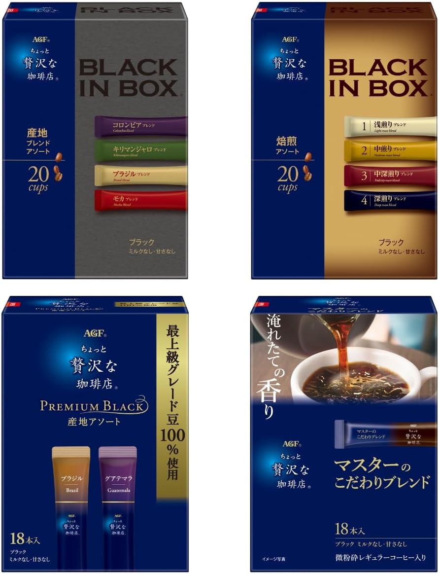 ブランド:AGF(エージーエフ)商品の形状:ホールビーン風味:キャラメルローストレベル:dark_roastパッケージ情報:バッグユニット数:1 個商品の個数:4特別な原料:【産地ブレンドアソート】コーヒー豆(生豆生産国名:[ブラジル・ブレンド/ブラジル、ベトナム、他][モカ・ブレンド/エチオピア、ブラジル、他][キリマンジャロ・ブレンド/タンザニア、ブラジル、他][コロンビア・ブレンド/コロンビア、ブラジル、他]) 【焙煎アソート】[中煎りブレンド:コーヒー豆(コーヒー豆(生豆生産国名:コロンビア、ブラジル、他)][浅煎りブレンド:インスタントコーヒー(コーヒー豆(エチオピア、ブラジル、その他)) / 香料][中深煎りブレンド:インスタントコーヒー(コーヒー豆(タンザニア、ブラジル、その他)) / 香料][深煎りブレンド:インスタントコーヒー(コーヒー豆(ブラジル、ベトナム、その他)) / 香料] 【グアテマラ最上級グレード豆100%】コーヒー豆(生豆生産国名:グアテマラ) 【ブラジル最上級グレード豆100%】コーヒー豆(生豆生産国名:ブラジル)【産地ブレンドアソート】コーヒー豆(生豆生産国名:[ブラジル・ブレンド/ブラジル、ベトナム、他][モカ・ブレンド/エチオピア、ブラジル、他][キリマンジャロ・ブレンド/タン… 表示を増やす商品の重量:0.28 キログラム個数:1, 6ブランド:AGF(エージーエフ)梱包サイズ:36.8 x 15.5 x 6.8 cm; 280 g商品タイプ:ホールビーン容器の種類:バッグメーカー:AGF(エージーエフ)原材料:【産地ブレンドアソート】コーヒー豆(生豆生産国名:[ブラジル・ブレンド/ブラジル、ベトナム、他][モカ・ブレンド/エチオピア、ブラジル、他][キリマンジャロ・ブレンド/タンザニア、ブラジル、他][コロンビア・ブレンド/コロンビア、ブラジル、他]) 【焙煎アソート】[中煎りブレンド:コーヒー豆(コーヒー豆(生豆生産国名:コロンビア、ブラジル、他)][浅煎りブレンド:インスタントコーヒー(コーヒー豆(エチオピア、ブラジル、その他)) / 香料][中深煎りブレンド:インスタントコーヒー(コーヒー豆(タンザニア、ブラジル、その他)) / 香料][深煎りブレンド:インスタントコーヒー(コーヒー豆(ブラジル、ベトナム、その他)) / 香料] 【グアテマラ最上級グレード豆100%】コーヒー豆(生豆生産国名:グアテマラ) 【ブラジル最上級グレード豆100%】コーヒー豆(生豆生産国名:ブラジル)商品の重量:280 gメーカー名:AGFブランド名:ちょっと贅沢な珈琲店商品タイプ:インスタントコーヒー[スティックコーヒー(ブラック)]原産国:日本賞味期限:製造日から 750 日おいしい飲み方:【ホットの場合】:スティック1本にお湯(140ml~180ml)を入れ、よくかきまぜてください。【アイスの場合】:スティック1本にお湯(70ml~90ml)を入れてよくかきまぜ、氷を5~6個入れてください。※お好みに合わせて砂糖やミルクを入れても楽しめます。【セット内容】産地アソート 20本、焙煎アソート 20本、グアテマラ最上級グレード豆100% 20本、ブラジル最上級グレード豆100% 20本「ちょっと贅沢な珈琲店 ブラックインボックス」 産地ブレンドアソート20本は、〈コロンビア・ブレンド〉〈ブラジル・ブレンド〉〈モカ・ブレンド〉〈キリマンジャロ・ブレンド〉の4種のこだわりの味わいが1箱で楽しめる中容量サイズです。「ちょっと贅沢な珈琲店 ブラックインボックス」 焙煎アソート20本は、〈浅煎りブレンド〉〈中煎りブレンド〉〈中深煎りブレンド〉〈深煎りブレンド〉の焙煎度の異なる、4種のこだわりの味わいが1箱で楽しめる中容量サイズです。「ちょっと贅沢な珈琲店」 プレミアムブラックグアテマラ最上級グレード豆100% 20本は、グアテマラ産最上級グレード豆SHBを100%使用した、キャラメルのような甘い香り、上品な酸味と澄んだ後味が愉しめるスティックタイプのインスタントコーヒーです。「ちょっと贅沢な珈琲店」プレミアムブラックブラジル最上級グレード豆100% 20本は、ブラジル産最上級グレード豆を100%使用した、ナッツのような香ばしさ、調和の取れた味わいが愉しめるスティックタイプのインスタントコーヒーです。1杯1杯がいつも新鮮な個包装スティックコーヒー(ブラック、ミルクなし、甘さなし)です。ブラックコーヒーではもちろんお好みでスティックシュガーやスティックコーヒーミルクと一緒にオフィスやご家庭でお楽しみください。アソートだから気分に合わせてバラエティ豊かなコーヒーをお楽しみにいただけます。コーヒー豆の焙煎から充填まで国内の工場で一貫生産し、繊細な日本人の味覚に合わせて開発したインスタントスティックコーヒーです。