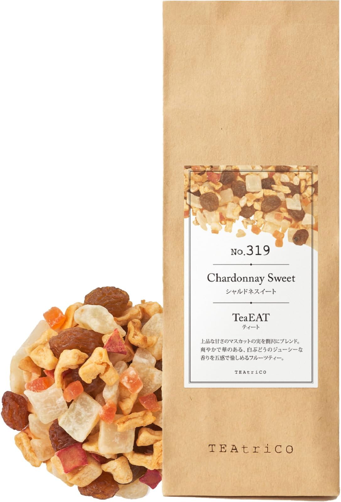 フレーバー名:シャルドネスイートサイズ:50gブランド:TEAtriCO(ティートリコ)商品の形状:ルーズリーフ風味:シャルドネスイートユニット数:50.0 グラム商品の個数:1パッケージ情報:バッグカフェイン含有量:カフェインフリー商品の重量:50 グラムアレルギー情報:リンゴメーカー:TEAtriCO(ティートリコ)ブランド:TEAtriCO(ティートリコ)梱包サイズ:16.8 x 5.9 x 3.6 cm; 50 g商品タイプ:ルーズリーフカフェインタイプ:カフェインフリー容器の種類:バッグメーカー:TEAtriCO(ティートリコ)商品の重量:50 g上品な甘さのマスカットの実を贅沢にブレンド。爽やかで華のある、白ぶどうのジューシーな香りを五感で愉しめるフルーツティー。フルーツティーのパイオニア「ティートリコ」の代名詞 ”食べられるお茶”食べ飲みする "あたらしいお茶のカタチ”ノンカフェイン上品な甘さのマスカットの実を贅沢にブレンド。爽やかで華のある、白ぶどうのジューシーな香りを五感で愉しめるフルーツティー。