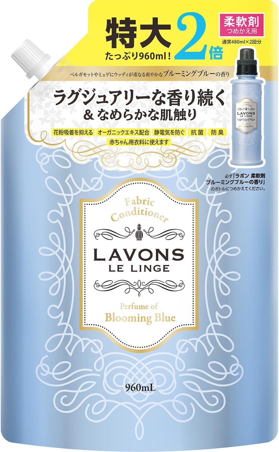 パターン名:詰め替え 2倍サイズ 960mlブランド:ラボン(Lavons)商品の形状:つめかえ用商品の個数:1香り:ホワイトムスク, ベルガモット, シダーウッド, スズラン, ピオニー, ムスク, ジャスミン, サンダルウッド商品特長:ソフトニング素材の特徴:ヴィーガン, ナチュラル対象年齢:全ての年代メーカー:ラボン(Lavons)梱包サイズ:27.1 x 16.4 x 6 cm; 980 g商品の仕様、用途:衣類・リネン, 詰め替え対象年齢:全ての年代対象性別:ユニセックス香りの系統:ホワイトムスク, ベルガモット, シダーウッド, スズラン, ピオニー, ムスク, ジャスミン, サンダルウッド原産国/地域:日本商品の特徴:柔軟剤配合植物由来の柔軟成分配合で、赤ちゃん用衣類にも使える柔らかな手触りに天然由来の香料を配合。香水のようなラグジュアリーな香りが持続する柔軟剤ベルガモットやミュゲにホワイトムスクが重なる爽やかなブルーミングブルーの香り原産国:日本内容量:960ml(通常詰め替えの2倍)天然由来の香料を配合し、洗濯中から着用時まで香水のようなラグジュアリーな香りが持続。植物由来の柔軟成分配合でなめらかな肌触りに。赤ちゃん用衣類にも使えます。ベルガモットやミュゲにホワイトムスクが重なる爽やかなブルーミングブルーの香り※パッケージデザイン等は予告なく変更されることがあります
