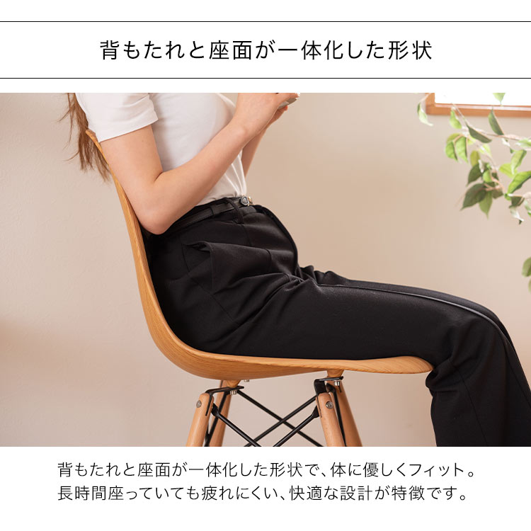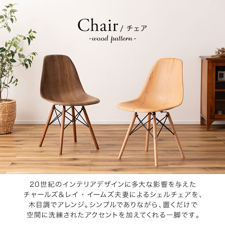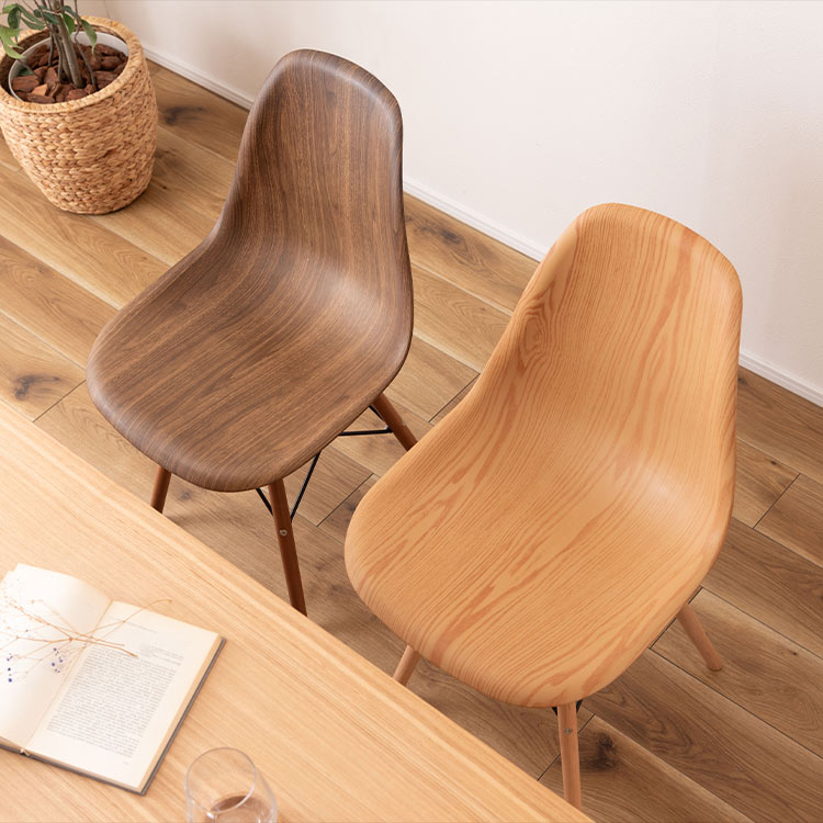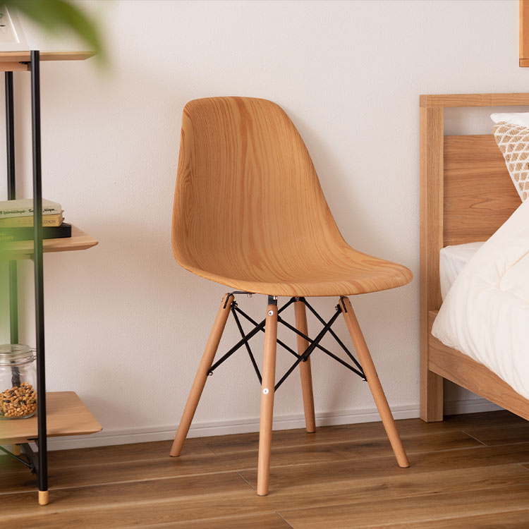 20世紀のインテリアデザインに多大な影響を与えたチャールズ&レイ・イームズ夫妻によるシェルチェアを、木目調でアレンジ。シンプルでありながら、置くだけで空間に洗練されたアクセントを加えてくれる一脚です。