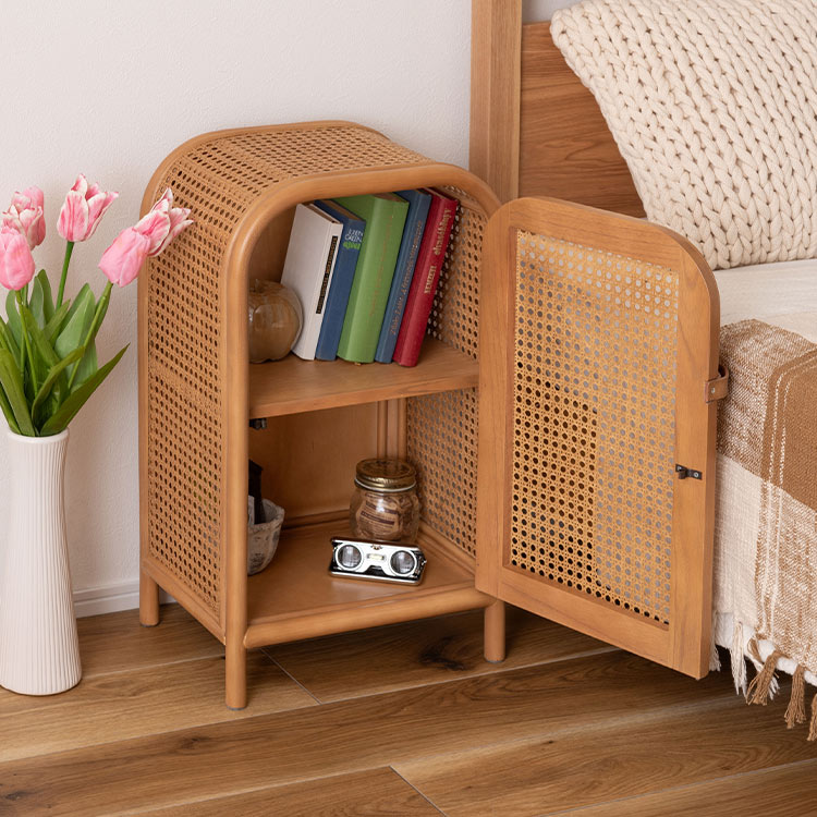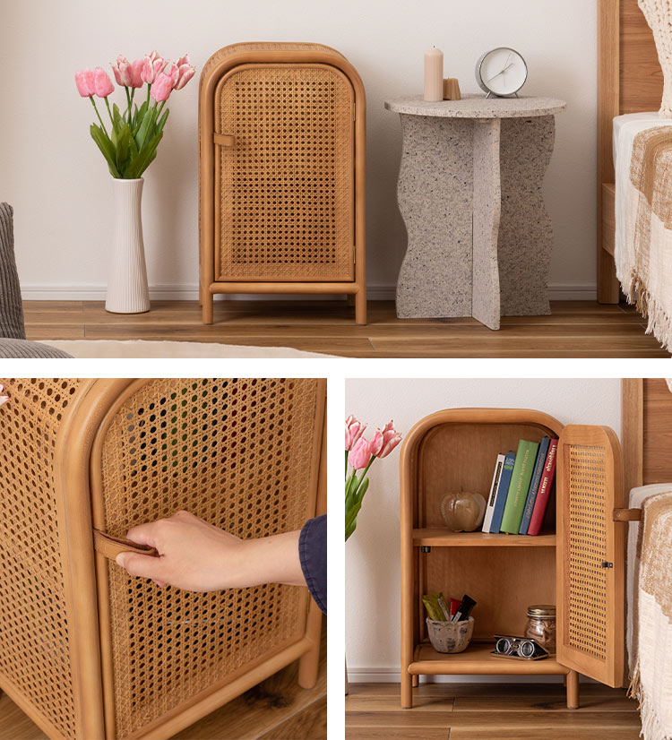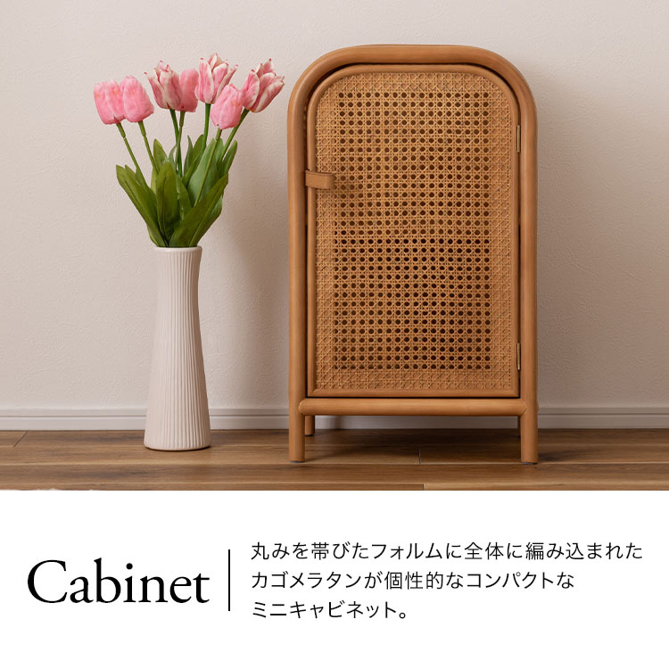 丸みを帯びたフォルムに全体に編み込まれたカゴメラタンが個性的なコンパクトなミニキャビネット。コンパクトなサイズ感で、ベッドサイドに置いておくのにも丁度良い大きさ。サッと取り出したい物をしまっておくと◎全体的に角が無く、丸みを帯びたフォルムにデザインされています。素材の風合いとも相まってより柔らかい印象に。「かごめ編み」という技法で編まれた天然ラタンを使用。ひとつひとつ違った風合いを楽しめるのもポイントです。