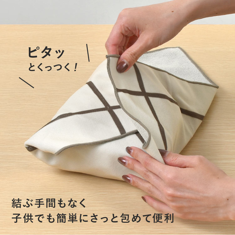 生地の裏表がピタッとくっつく不思議な風呂敷。形状に合わせてしっかりと包むことができ、内側は保冷シート付き。お弁当、ペットボトル、傘を包んだりさまざまなシーンで活躍します。結ぶ手間もなく子供でも簡単にさっと包むことができます。