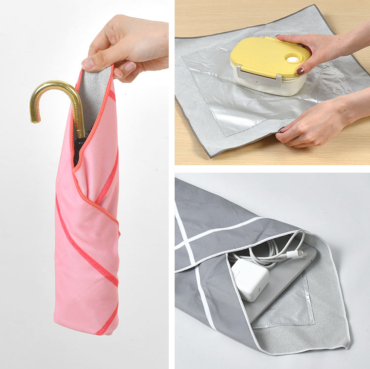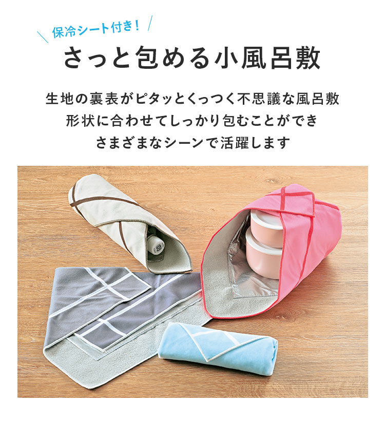 生地の裏表がピタッとくっつく不思議な風呂敷。形状に合わせてしっかりと包むことができ、内側は保冷シート付き。お弁当、ペットボトル、傘を包んだりさまざまなシーンで活躍します。結ぶ手間もなく子供でも簡単にさっと包むことができます。