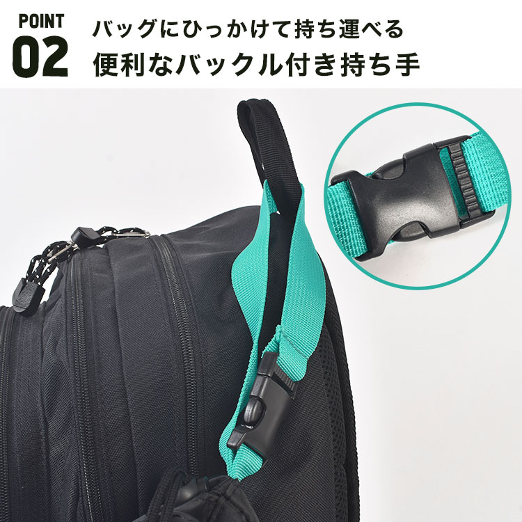 持ち手にはバックルが付いており、バッグやリュックにひっかけて持ち運べます。