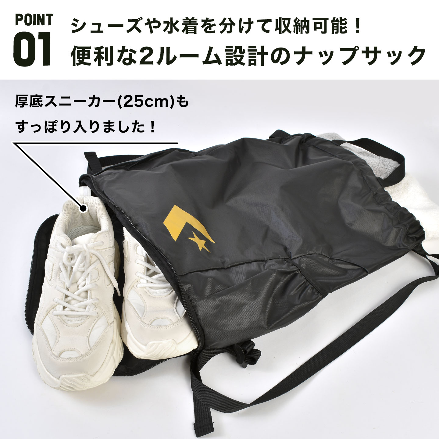 軽量かつ大容量!靴や濡れた水着などを分けて収納できる2ルーム仕様のナップサック。シンプルなコンバースロゴのデザインで子供から大人まで幅広く使えるアイテムです。