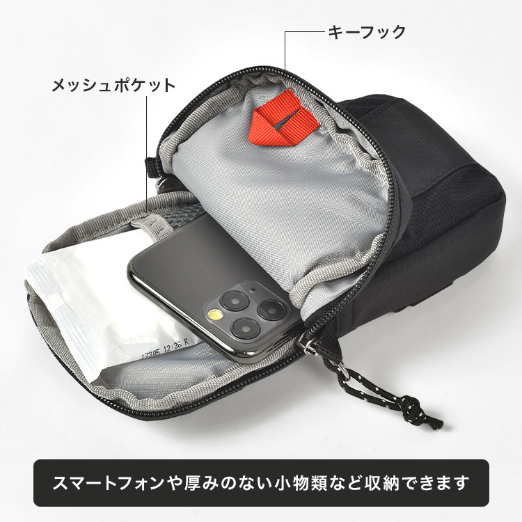快適なハイクをサポートする外付けマルチポーチ。バックパックのショルダーハーネスやウエストベルトに外付けできる固定用ホルダーとループ付き。カラビナフック付きで単独でも使用可能。メインコンパートメント内部は大きめサイズのモバイル端末を収納可能です。フロントポケットはトリコット素材でサングラスのレンズを保護してくれます。普段使いはもちろん、ハイキングのお供に便利なポーチです。