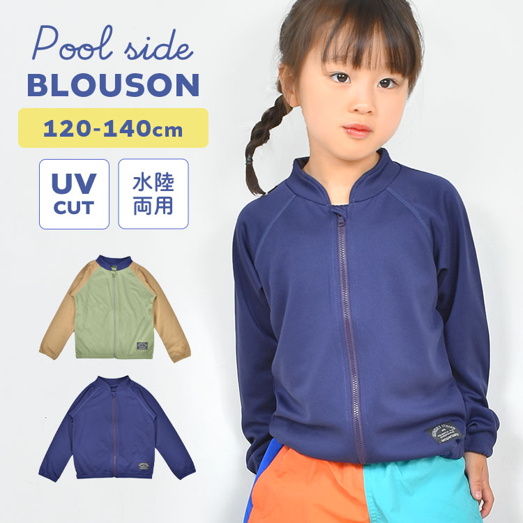 UVプロテクト機能付きのプールサイドブルゾン。屋外の視線からお肌をしっかりガードします。男の子も女の子も着用しやすいシンプルデザイン。前開きのファスナータイプでサッと羽織れば日焼け止めを塗り直す手間もなく楽ちん♪さらっとした手触りの生地で伸縮性もバッチリ◎カーキとネイビーの2色展開です。