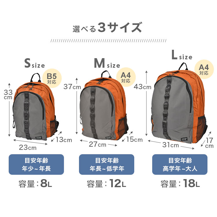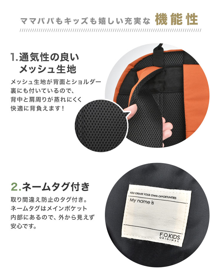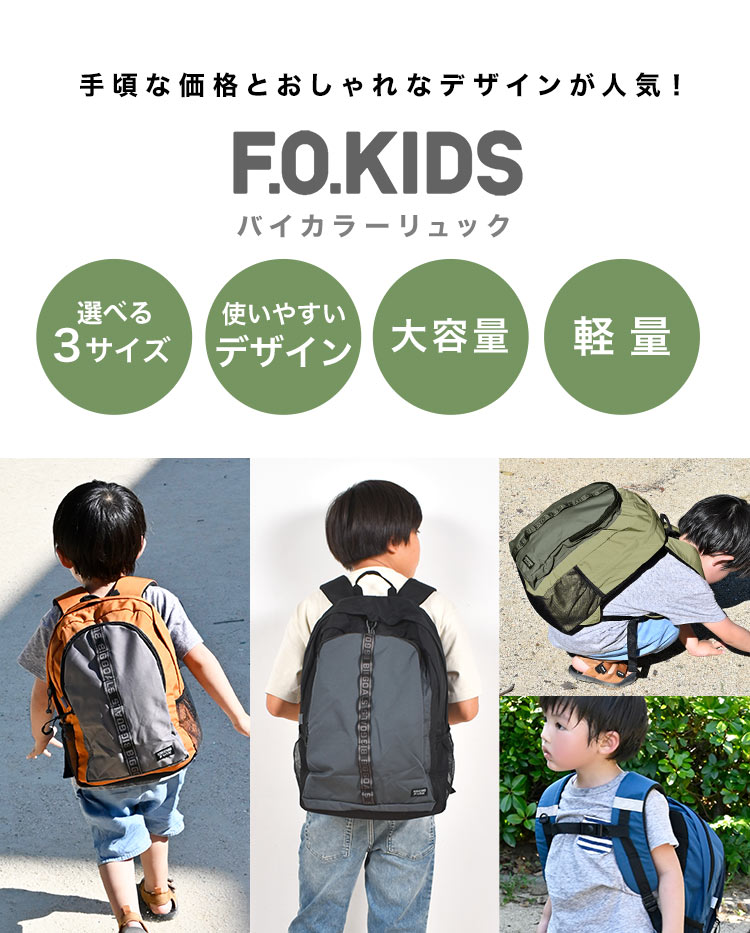 Details バイカラーリュック 手頃な価格とおしゃれなデザインが人気!F.O.KIDSのバイカラーリュック 8L、12L、18Lの嬉しい3サイズ展開で、子供から大人まで幅広く対応しています。落下防止のハーネス付きで、通気性の良いメッシュ生地を背面とショルダーに使用しており、ボトルや折り畳み傘などが収納できるサイドポケットが付いています。バイカラーのおしゃれな色合いとシンプルなデザインは、どんな服装にも合わせやすく、お子様の成長に合わせて長く使うことができます。日常の学校用から遠足、旅行まで幅広いシーンで使えるオススメのリュックです。 ブランド名 F.O.KIDS / エフ・オー・キッズ 品番 R466014 サイズ Sサイズ:約H330×W230×D130mm Mサイズ:約H370×W270×D150mm Lサイズ:約H430×W310×D170mm 容量 Sサイズ:8L Mサイズ:12L Lサイズ:18L 重量 Sサイズ:250g Mサイズ:300g Lサイズ:370g 素材 グログラン 生産国 中国 ご注意 ※表記サイズより、多少の誤差があることがございます。 ※商品の画像はできる限り実物に近づけるよう配慮しておりますが、お使いのモニターやご覧になる環境によりましてはカラーの見え方に差が出る場合がございます。ご了承くださいませ。 関連キーワード F.O. KIDS 子供服 ブランド 通学リュック こども S M L 3サイズ ベルト 多機能 入園 入学 防災 旅行 お出かけ バイカラー 青 オレンジ カーキ グリーン ベーシック シンプル 2カラー ファスナー チェストベルト ハーネス付き 落下防止 メッシュ素材 通気性 蒸れにくい サイドポケット リフレクター 反射素材 ボトル 水筒 折り畳み傘 通園リュック 通園バッグ 通学リュック 通学バッグ 子供リュック キッズリュックサック 子供バックパック バックパック デイパック 塾 スポーツ 緑 4歳 5歳 6歳 7歳 8歳 9歳 10代 小学 1年 2年 3年 4年 一年 二年 三年 四年 生 保育園 保育所 幼稚園 年長 入園 入学 準備 入園準備 入学準備 通園 通学 ガールズ レディース ボーイズ メンズ 大人 誕生日 プチ ミニ ギフト 卒業 卒園 祝い お祝い お返し 粗品 景品 イベント クリスマス クリスマスプレゼント お洒落 カワイイ かっこいい カッコいい カッコイイ リュック Fo kids エフオーキッズ 高学年 ジュニア リュックサック ハーネス 大容量 バックパック 子ども 通園 通学 8L 12L 18L A4 B5 軽量 デイパック 小さめ 大きめ 低学年 3サイズ 遠足 塾 黒 ブラック ブルー | |||||||||||||