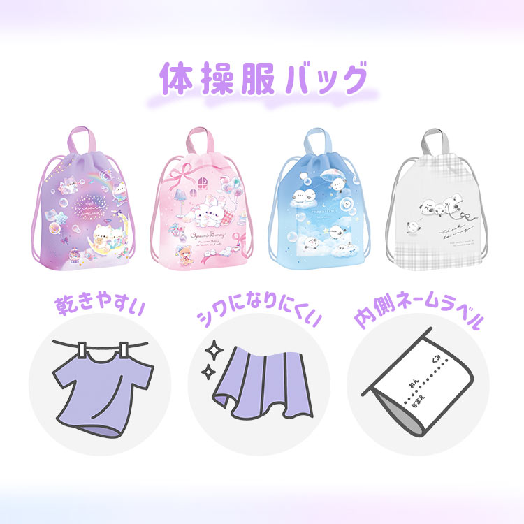 ファンシーなイラストがとってもキュートな体操服バッグ。さらっとしたポリエステル素材で、乾きやすくシワになりにくいのが嬉しいポイント。内側にはネームラベル付きで、紛失防止にも役立ちます◎ランドセルの上から背負えるので、通園・通学や習い事にぴったり!新入学・新学期の準備や買い替えにもおすすめです。