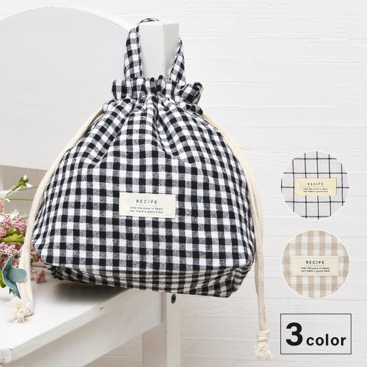 ランチ巾着 保冷 保温 弁当袋 巾着 ポーチ かわいい おしゃれ 女の子 小物入れ 小さめ 巾着袋 大人 レディース ギンガムチェック 黒 白 グレージュ ベージュ