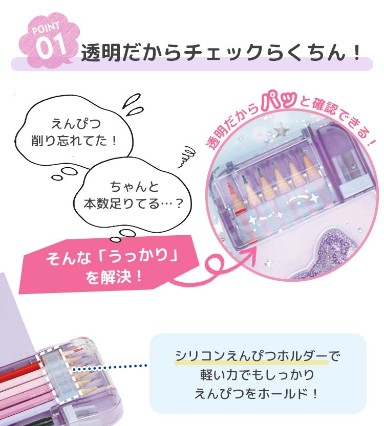 うっかり「鉛筆を削り忘れちゃった!」問題をサポートするえんぴつチェック両面筆入。フタを開けずに鉛筆の先端が見えるので、チェックがらくちんです◎Wシート補強で開閉耐久アップ!頑丈な造りで安心です♪赤・青鉛筆も余裕で入る鉛筆ホルダーは合計6本収納が可能で、裏面には三角定規や分度器も入る大容量。小学校の標準的な持ち物リストに対応しています。『リナティアラ』シリーズはキラキラでキュートなデザイン、『ブレイブ』シリーズはシンプルでかっこいいデザイン。長く使えるので入学祝いにもぴったりな筆箱です!