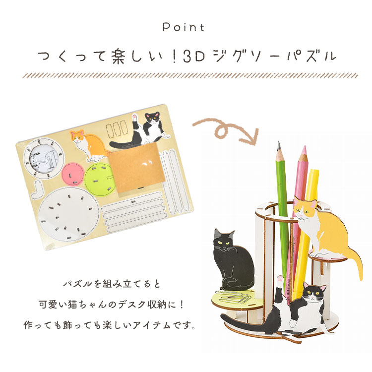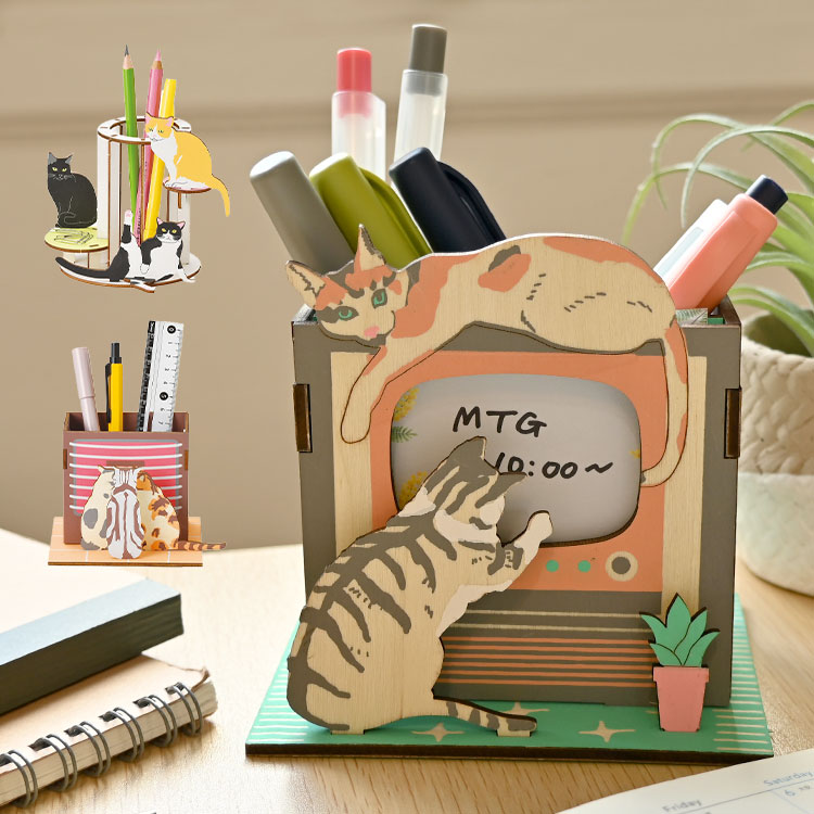 木製パズルを組み立てると猫ちゃんのデスク収納に変身!組み立て楽しい、飾って可愛いパズルシリーズが登場。猫好きさんへのプレゼントにもオススメです♪