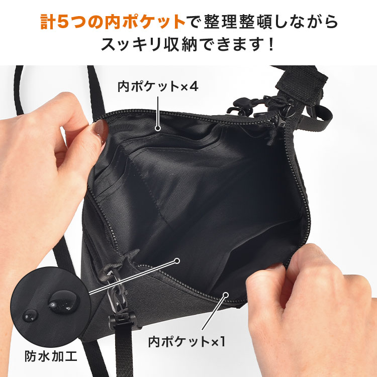 内側には計5つのポケット付きで、ハンカチやポケットティッシュ、コスメなどの小物を整理整頓しながらすっきり収納。背面にはファスナーポケット、前面にはバッグやベルトに取り付けられるスナップボタン付きで機能性も充実しています。
