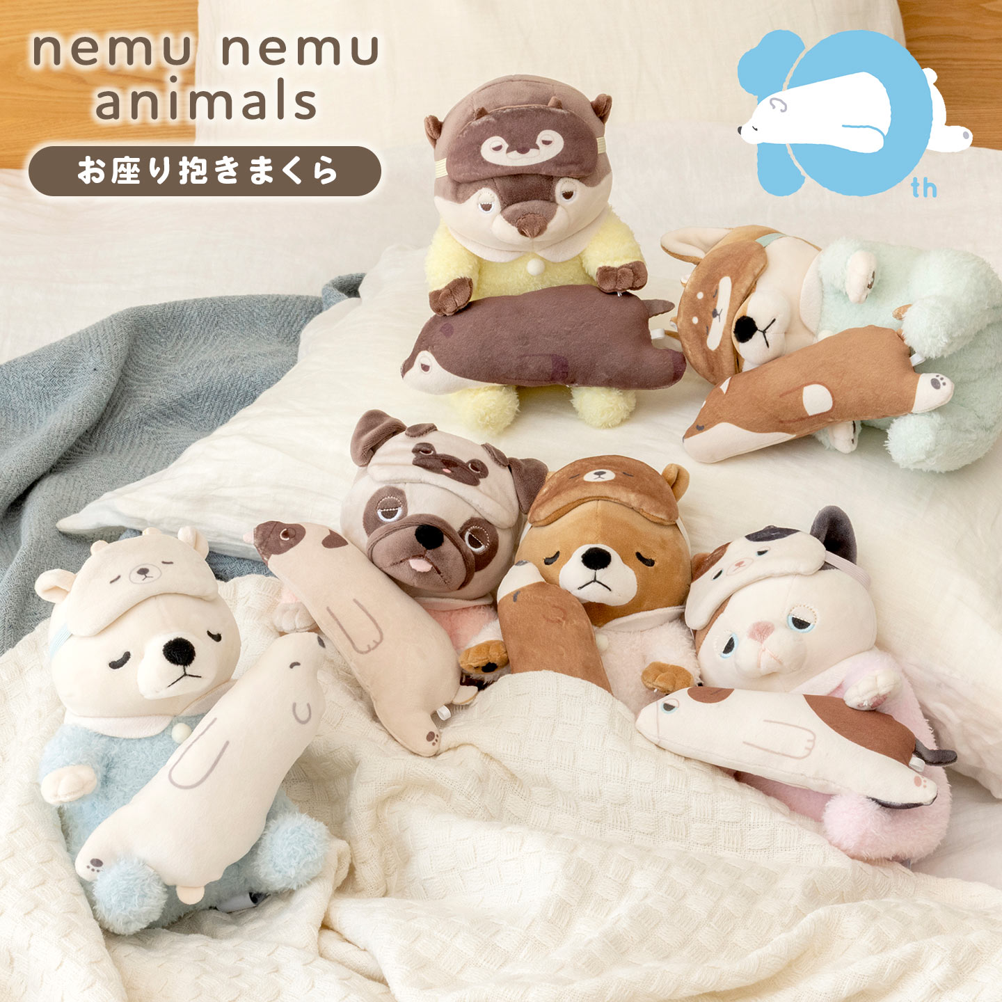 ねむねむアニマルズ10周年を記念した限定商品「お座り抱きまくら」。