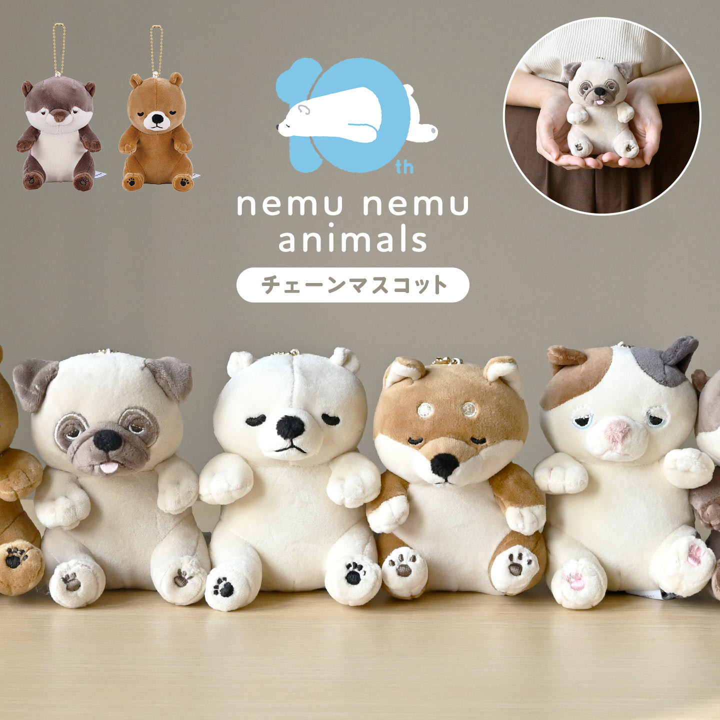 ねむねむアニマルズ10周年を記念した限定商品「チェーンマスコット」。
