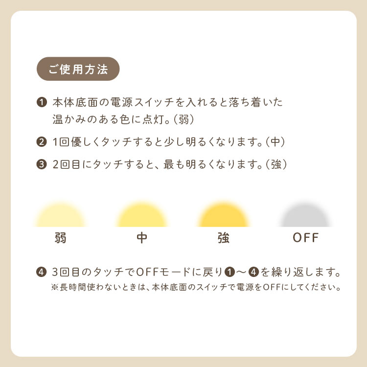 もちっとやわらかいシリコン製のルームランプは、温もりのある優しい光でお部屋を包み込みます。USBケーブルで簡単に充電できるので、手間いらず。読書や間接照明、授乳ランプとしても大活躍です。叩くだけで点灯するので、使い方もとっても簡単!