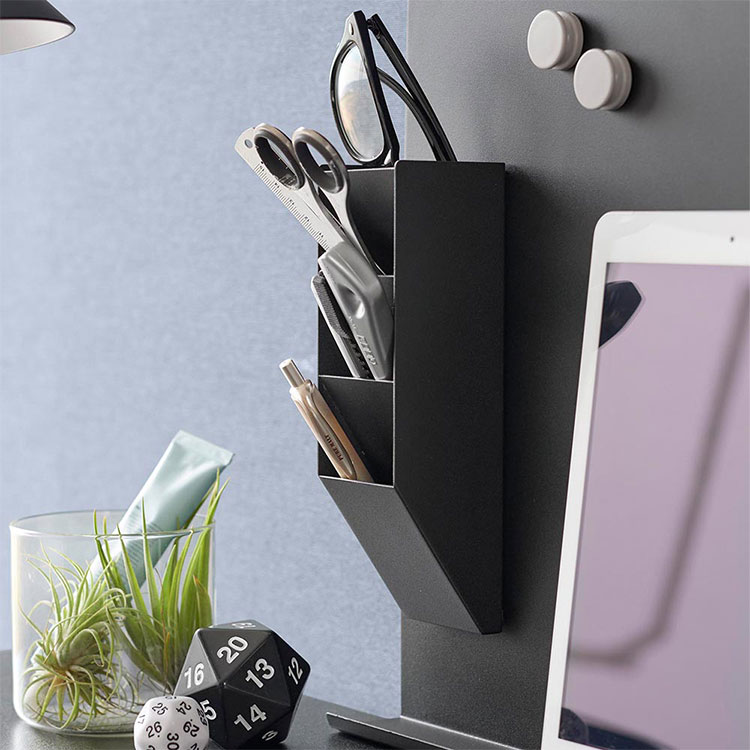 スチール壁面のお好みの場所に取り付けできる便利なペンスタンドです。別売りのデスク横トレー付きスチールパネル タワー(品番10066/10067)やマグネット棚 タワー スチールパネル対応(品番10094/10095)を一緒に使用すれば、デスク周りをスッキリ整理することができます。マスキングテープや薬などの小物を収納して、冷蔵庫横に取り付けるのもおすすめです。