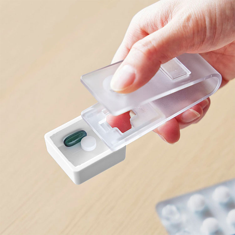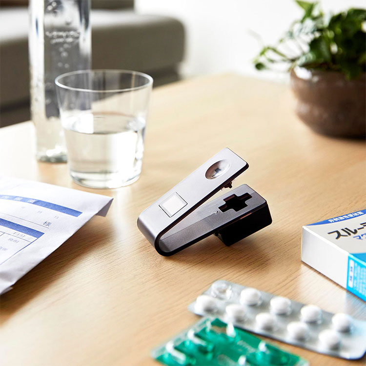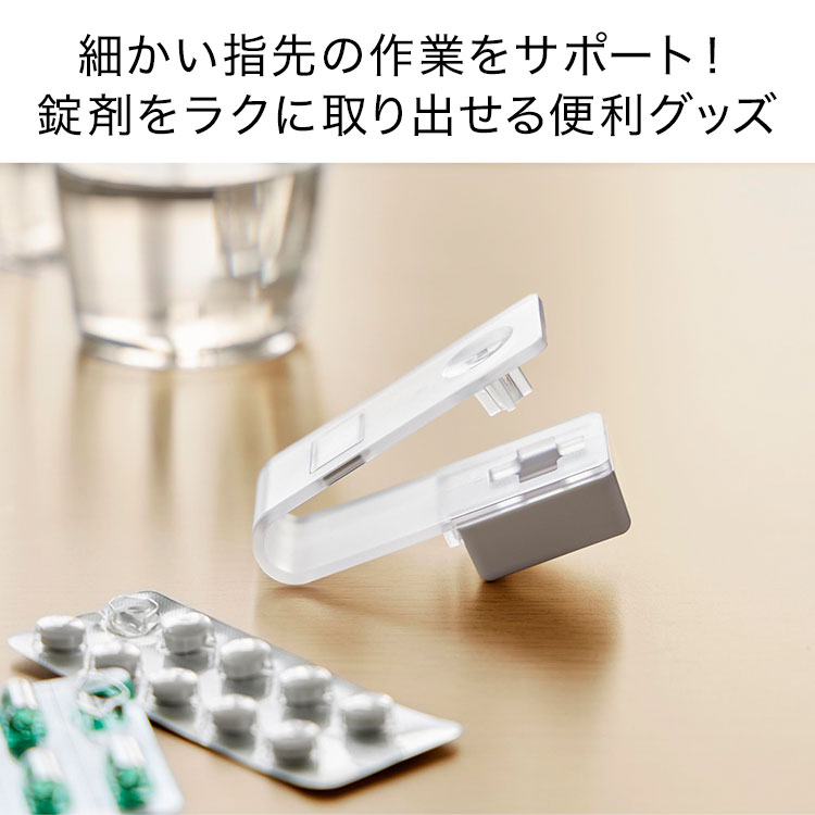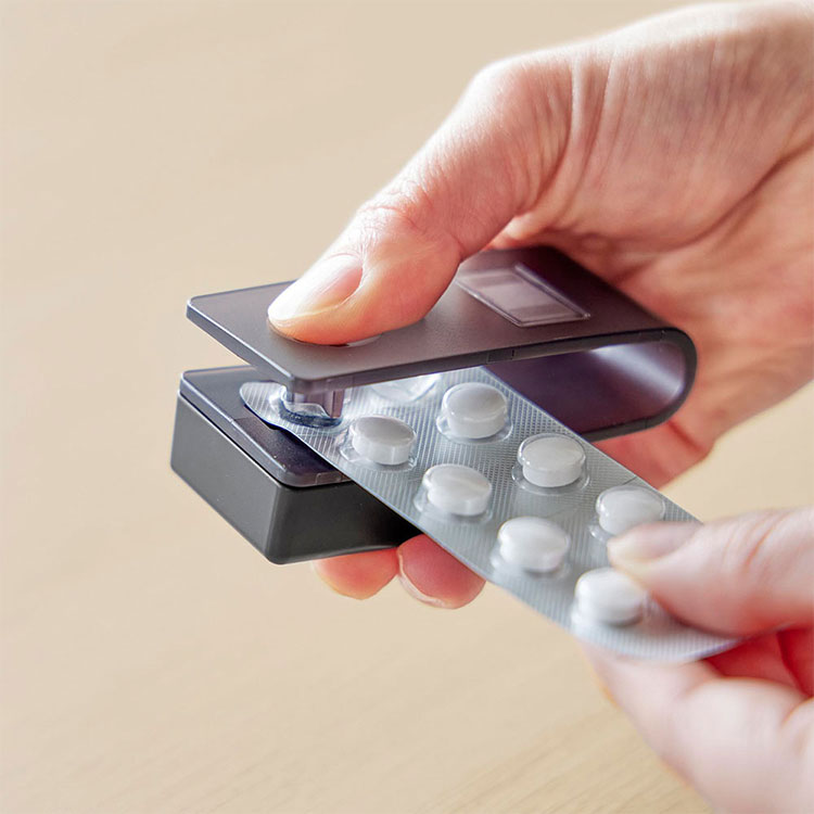薬をシートごと挟んでカチッと押し込むだけで、薬がシートから外れて受け皿に落ちる仕組みです。子どもや高齢者など、細かな力加減や指先の作業が難しい方でも、ラクに操作できます。