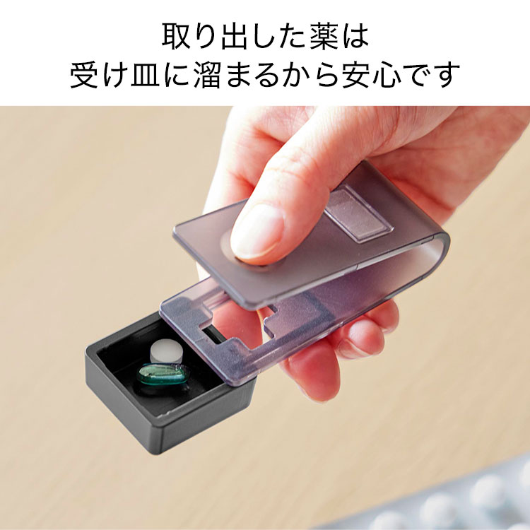 シートから取り出した薬は受け皿に溜まるので、手を滑らせて落としてしまう心配がありません。受け皿をスライドするだけで、簡単にサッと薬を手に取ることができます。