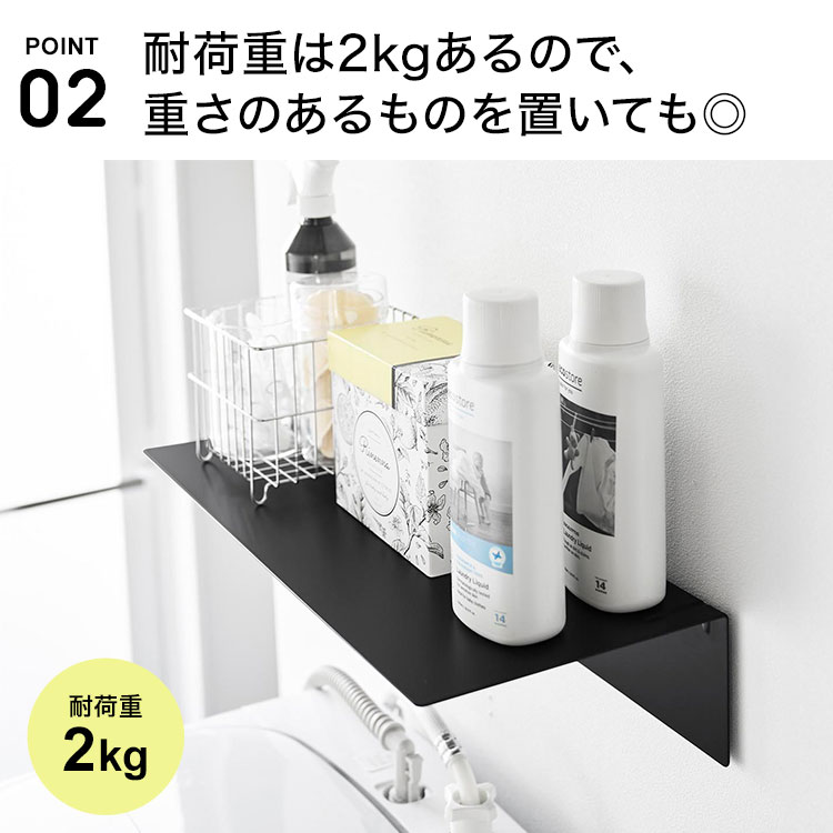 耐荷重は約2kg。洗剤ボトルや詰め替えパックなど、重さのあるランドリー用品も安心して収納可能です。日常使いにしっかり応える、安定感のある設計です。