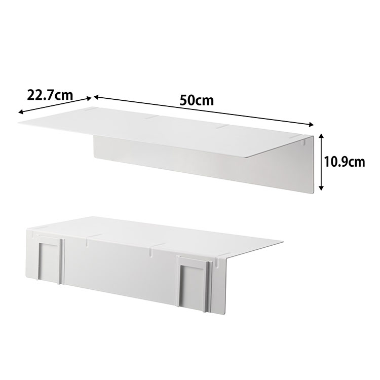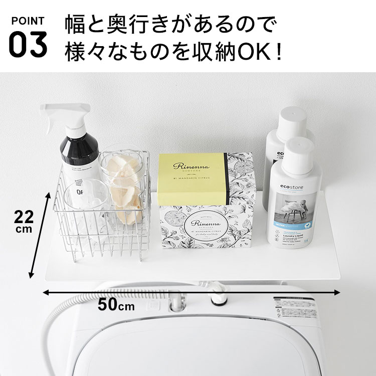 幅約50cm、奥行き約22cmの使いやすいサイズ感。洗剤・タオル・収納ケースなど、さまざまなアイテムをまとめて置けます。見せる収納としても使いやすく、空間にすっきり収まります。