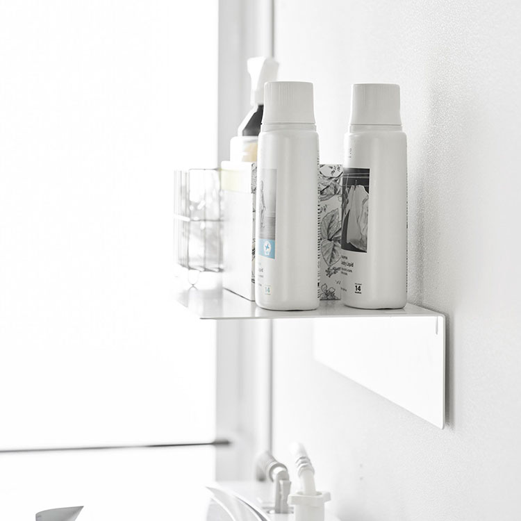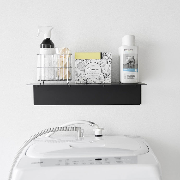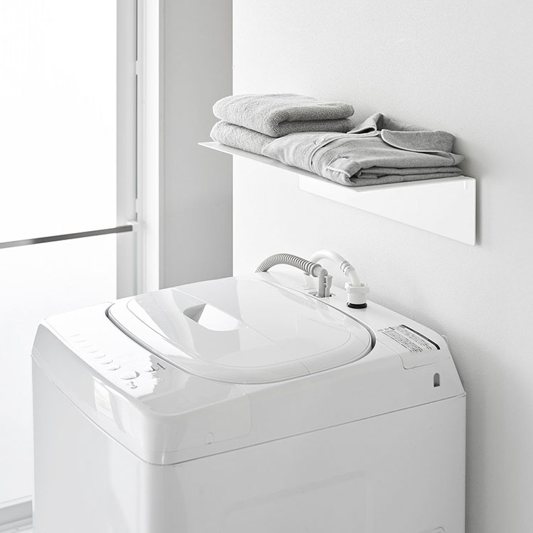 洗濯機上の空いているスペースを有効活用できる壁付けラック。タオルやランドリー用品をまとめて収納でき、限られた洗面所スペースをすっきり整えます。置き場所に困りがちなアイテムも、手の届く位置にスマートに配置できます。