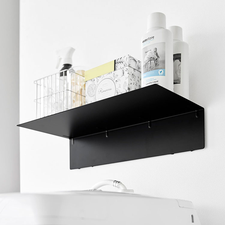 洗濯機上のスペースを有効活用できる、壁付け収納ラックです。タオルやランドリー用品をまとめて収納でき、耐荷重2kgのため、洗剤など重さのあるものも安心して置けます。幅と奥行きに余裕があり、様々なアイテムの収納に対応。壁の穴が目立ちにくい石こうボードピンで簡単取り付け。木ネジでも取り付け可能です。