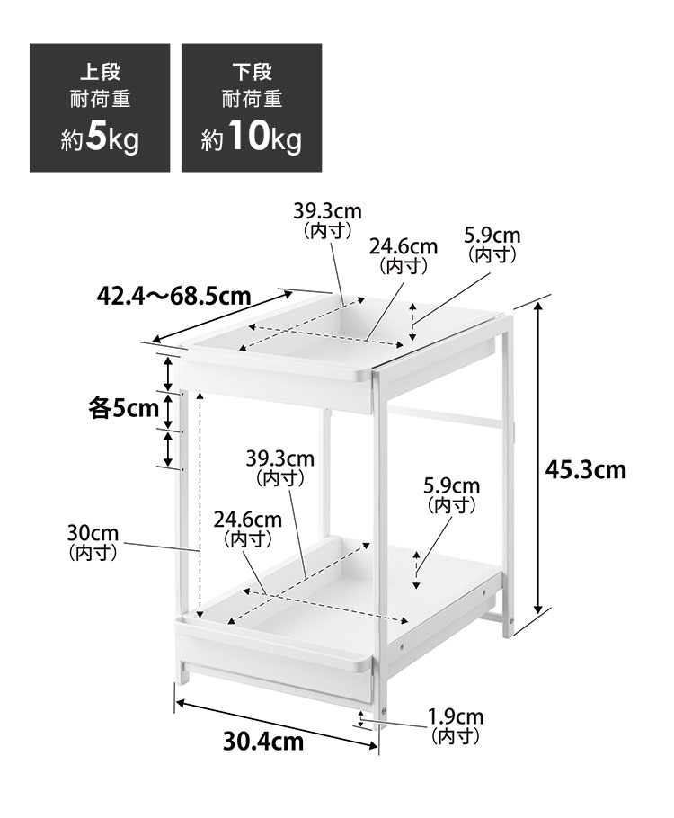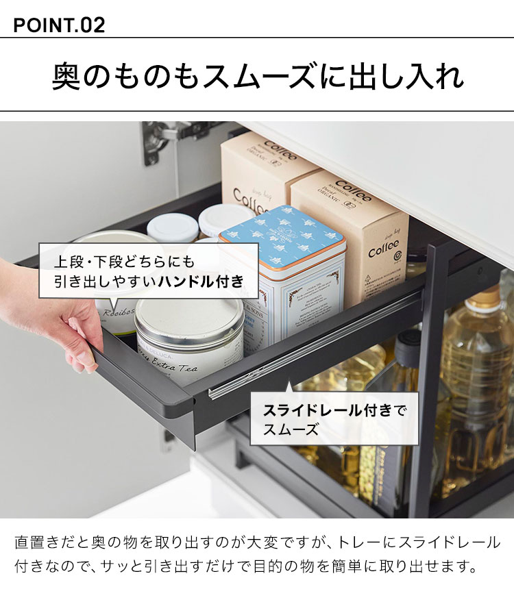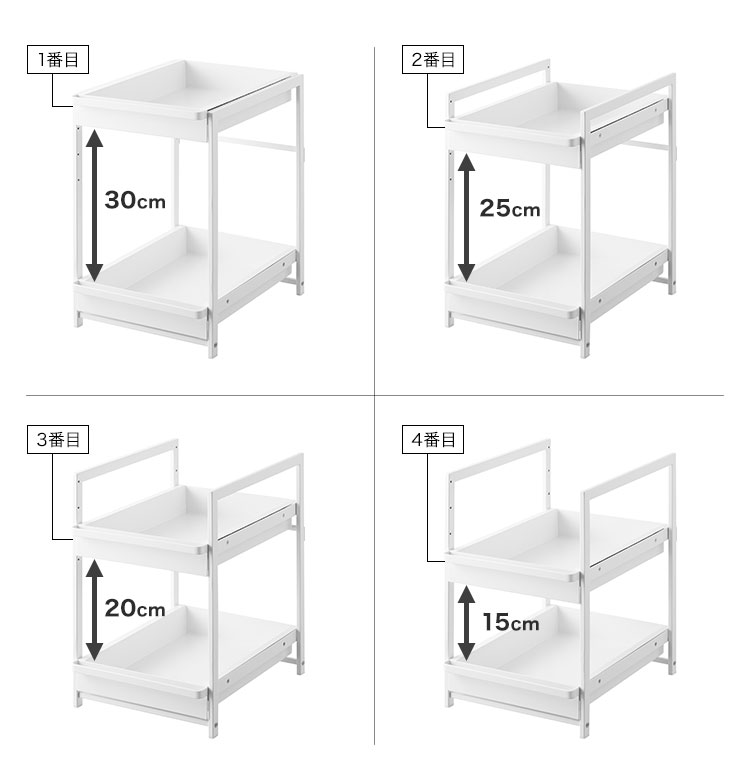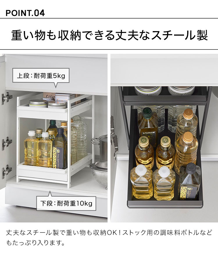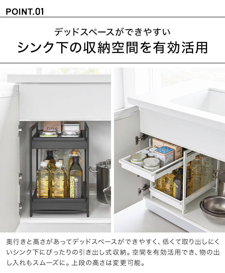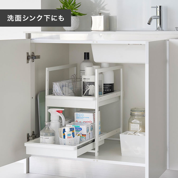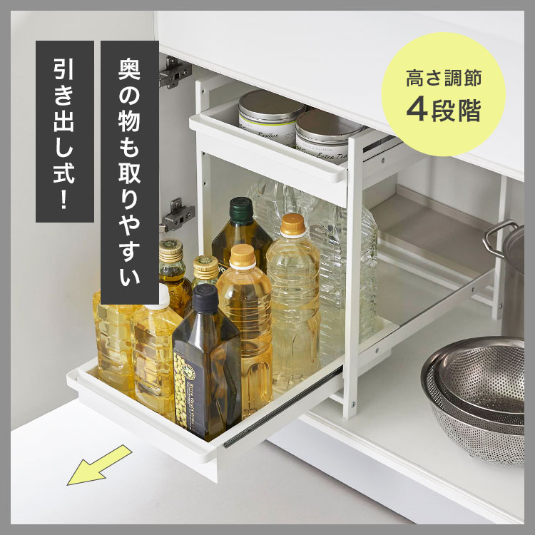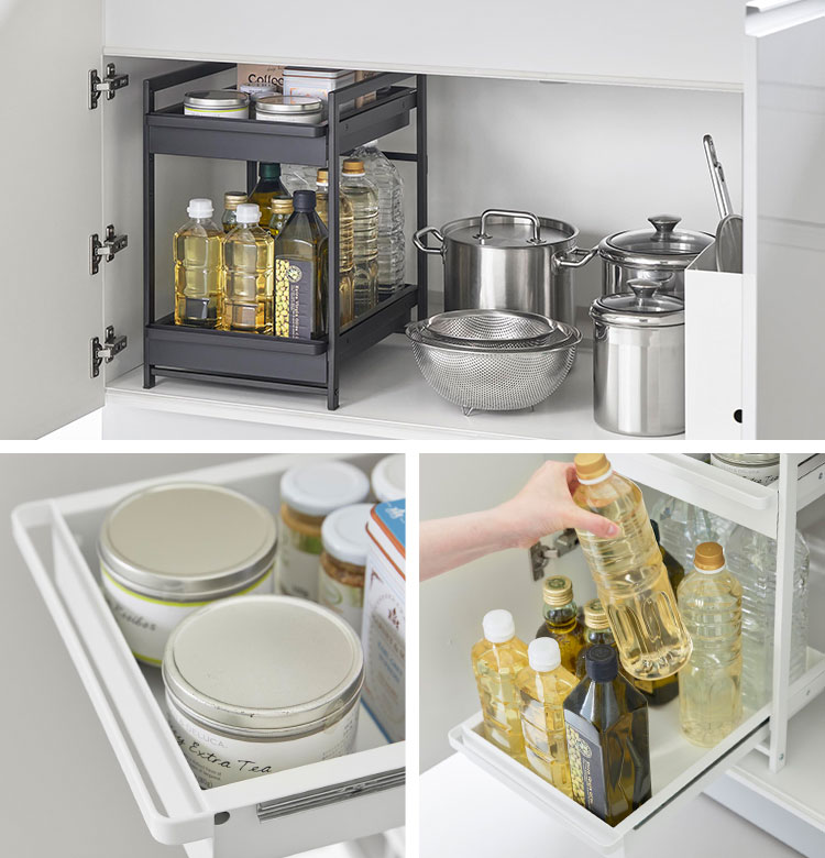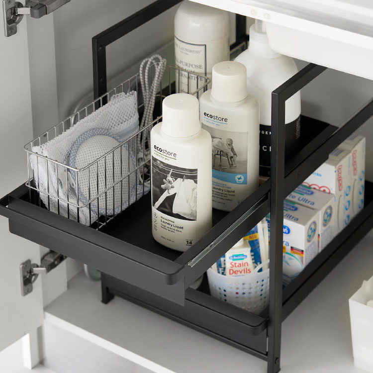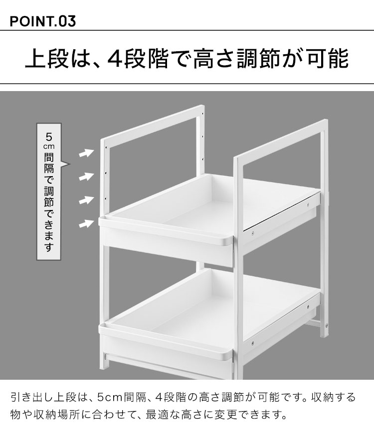 奥行と高さがあって収納が難しいシンク下を有効活用できるスライド式収納ラック2段。引き出しはハンドル付きで引き出しやすく、スライド式なので奥の収納物もスムーズに出し入れができます。引き出し上段は収納する物に合わせて、5cm刻みで高さが4段階調節できます。洗面台下への設置もおすすめです。