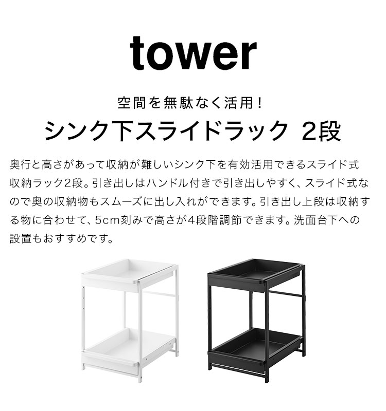 シンク下スライドラック 2段 山崎実業 タワー スライド 引き出し ラック シンク下収納 収納棚 tower キッチン収納 調味料 ボトル 収納 キッチンラック 高さ調節 戸棚収納 ストッカー 頑丈 丈夫 洗面台下 シンク下収納ワゴン 隙間収納 コンロ下 白 黒 ホワイト ブラック スタイリッシュ スライドラック 高さ調節 引き出しタイプ 整理整頓 台所収納 便利 収納ラック 棚 二段 大容量 1460 1461 耐荷重10kg シンプル おしゃれ 隙間収納 コンロ下収納 一人暮らし ひとり暮らし 1人暮らし 二人暮らし ふたり暮らし 2人暮らし 新生活 yamazaki 山実 やまじつ ヤマジツ やまざきじつぎょう たわー towerシリーズ ブランド インテリアブランド