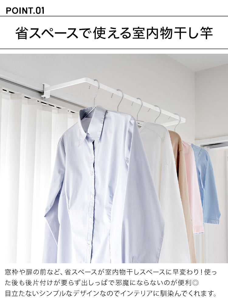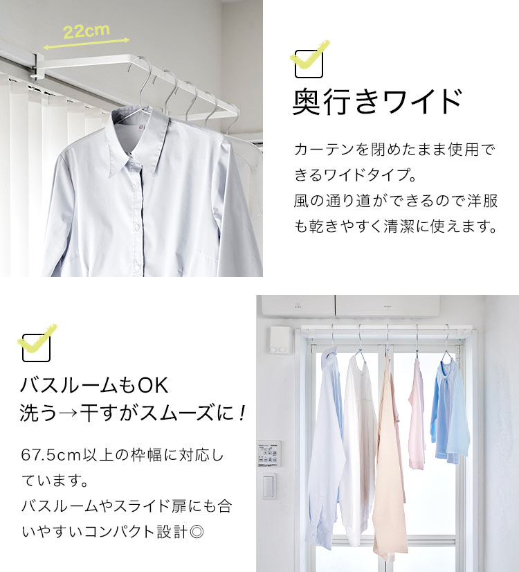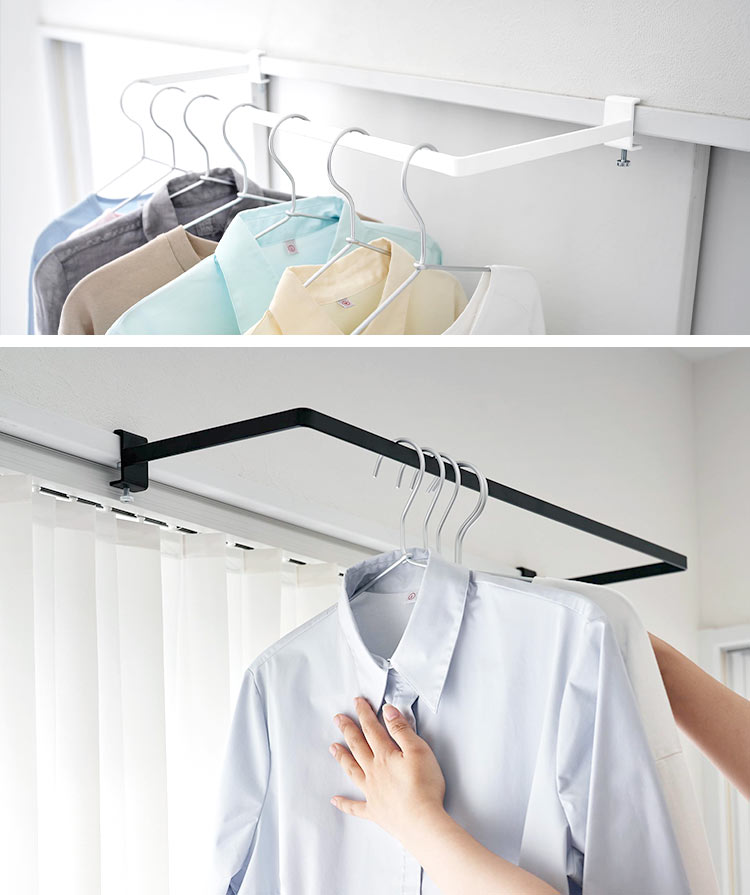 鴨居、窓枠などに簡単に取り付けできる室内物干しハンガー。カーテンを閉めた状態でも干せる奥行きワイドタイプです。カーテンやシェードに接触しにくく風の通る空間を作れます。ランドリールームに取り付ければ、洗う→干すがその場で完結。洗濯物はサッと集めて一気に取り込めます。