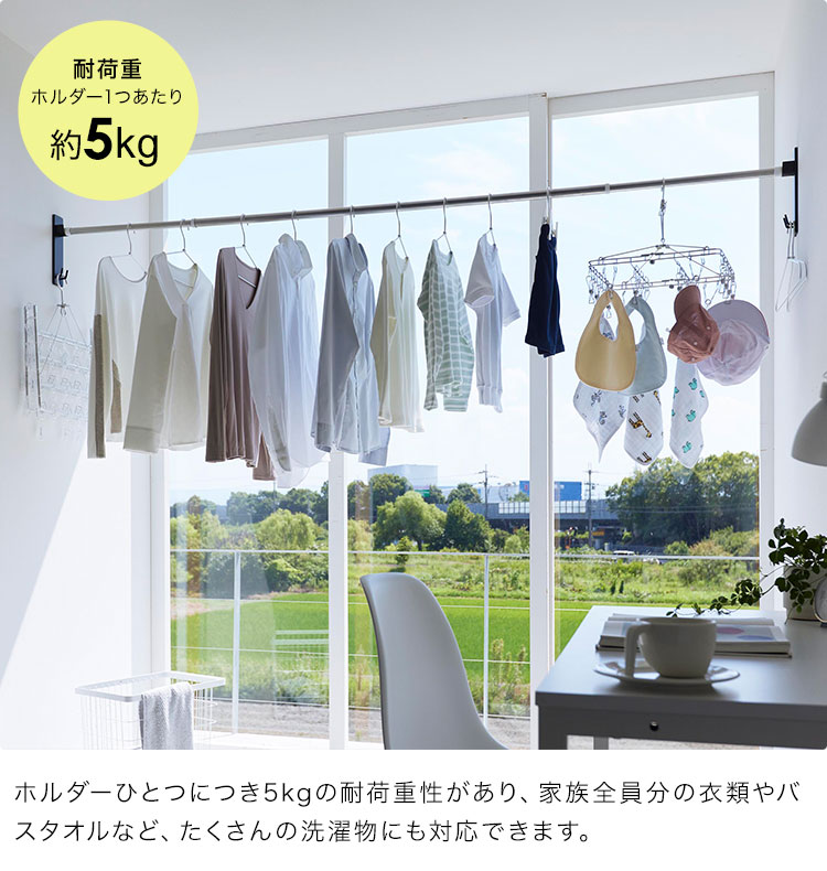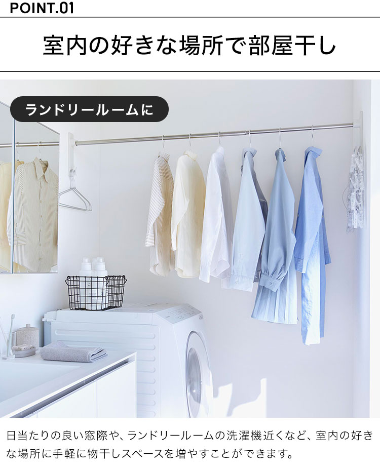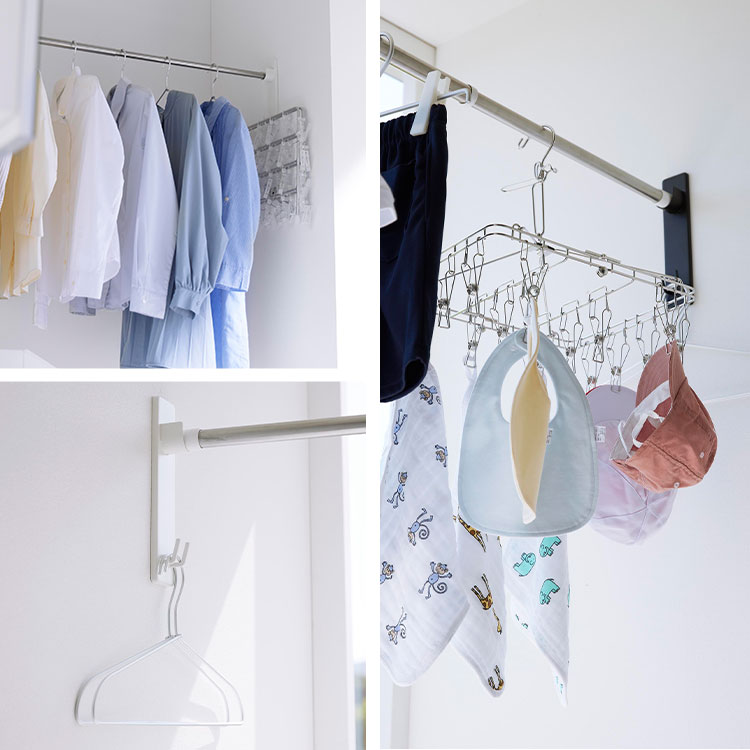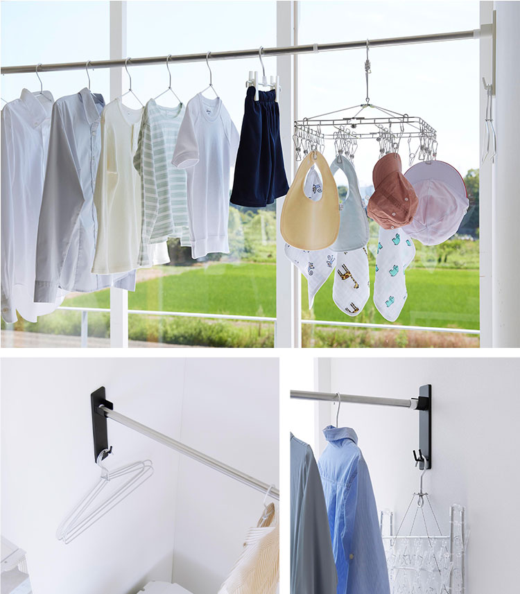 強い力や工具は不要。室内の壁面に石こうボードピンで簡単に取り付けできる物干し竿ホルダー。日当たりの良い窓辺や洗面所やランドリールームの壁面など、好きな場所に手軽に物干しスペースを設けることができます。外干しが難しい一人暮らしや花粉や梅雨、黄砂などが気になる季節にもぴったり。