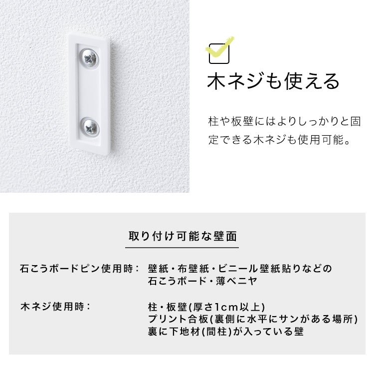 木ネジ使用時:柱・板壁(厚さ1cm以上)・プリント合板(裏側に水平にサンがある場所)・裏に下地材(間柱)が入っている壁