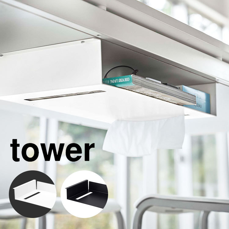 生活感をテーブル下に隠せる、towerのテーブル下収納ラック。よく使うリモコンやティッシュなどの小物をテーブル下に一括収納できます。ラック底面にはティッシュの取り出し口があり、ティッシュをラック下から引き出すことができます。リビングのテーブルや引き出しのない勉強机、仕事机などに取り付ければ、更に使い勝手がよくなりそうです◎