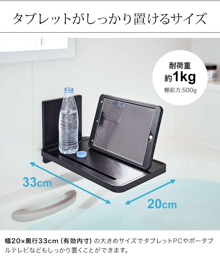 スマホやタブレット、おもちゃなどの一時置きに便利なtowerのマグネットバスルーム折りたたみ棚。マグネットで壁面に簡単に設置が可能です。使わない時は折りたたむことが出来るので壁面にすっきり収納することができます。また、幅20×奥行33cmと大きめサイズなのでタブレットやミニテレビもしっかり置くことができます。